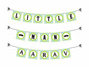 The Happy Birthday hanging that goes well with the Little Man theme can be strung anywhere across the room to add to the vibes.