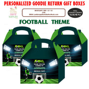 Colorful and Football theme based Goodie return gift boxes personalized with baby name for take away gifts for guests. Made of 225 GSM quality Art board material to withstand up to 200g to 400g of weight. This boxes can be used to gift items like Chocolates, Cookies, Cup cakes, etc..