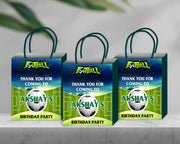 Colorful and Football theme based return gift bag personalized with baby name for take away gifts for guests. Made of 225 GSM quality Art board material and it can withstand upto 400g to 600g of weight also will have satin ribbon at the top to hold it (Colour of satin ribbon will be based on availability).