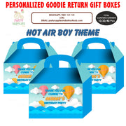 Colorful and Hot Air Boy ne theme based Goodie return gift boxes personalized with baby name for take away gifts for guests. Made of 225 GSM quality Art board material to withstand up to 200g to 400g of weight. This boxes can be used to gift items like Chocolates, Cookies, Cup cakes, etc..