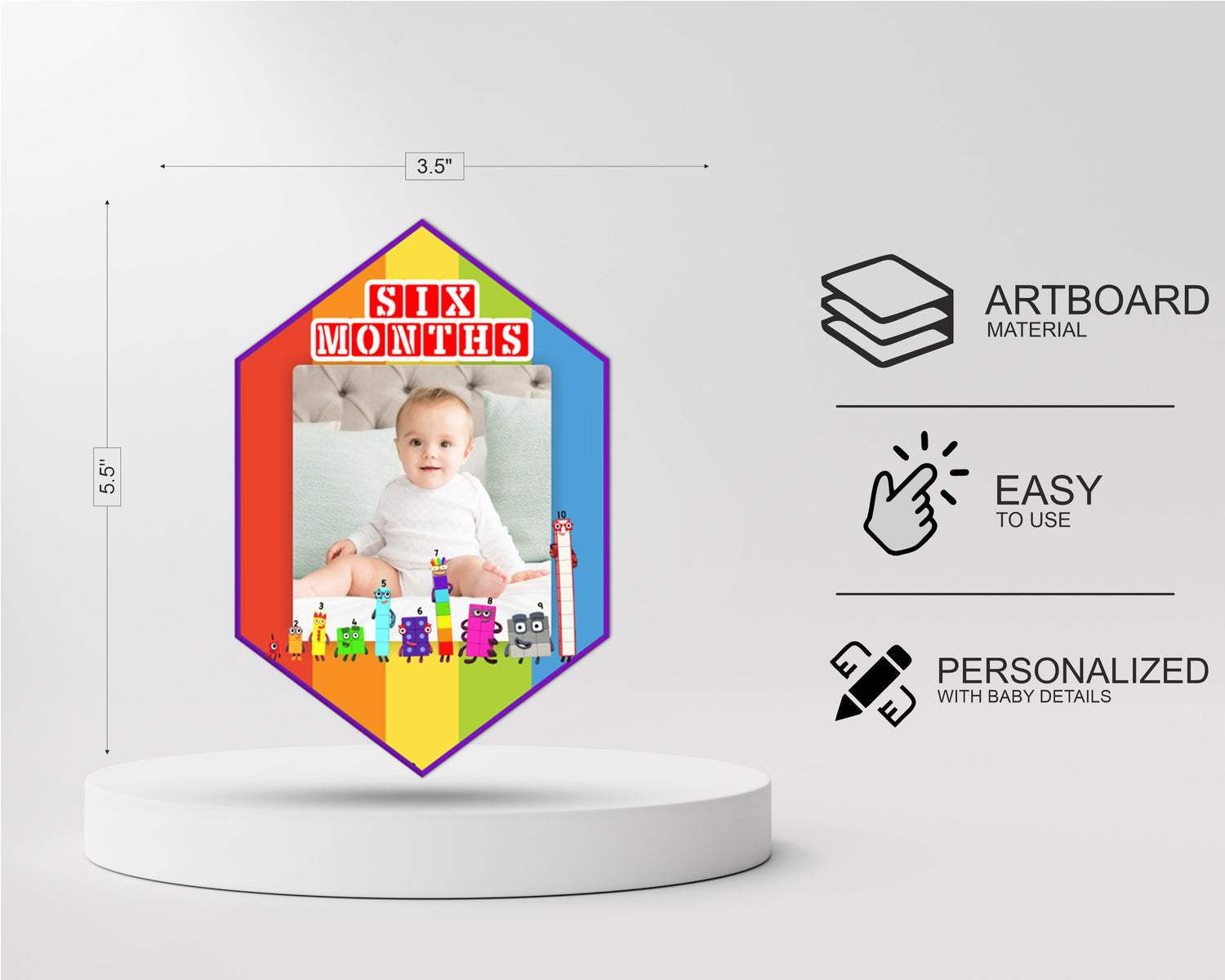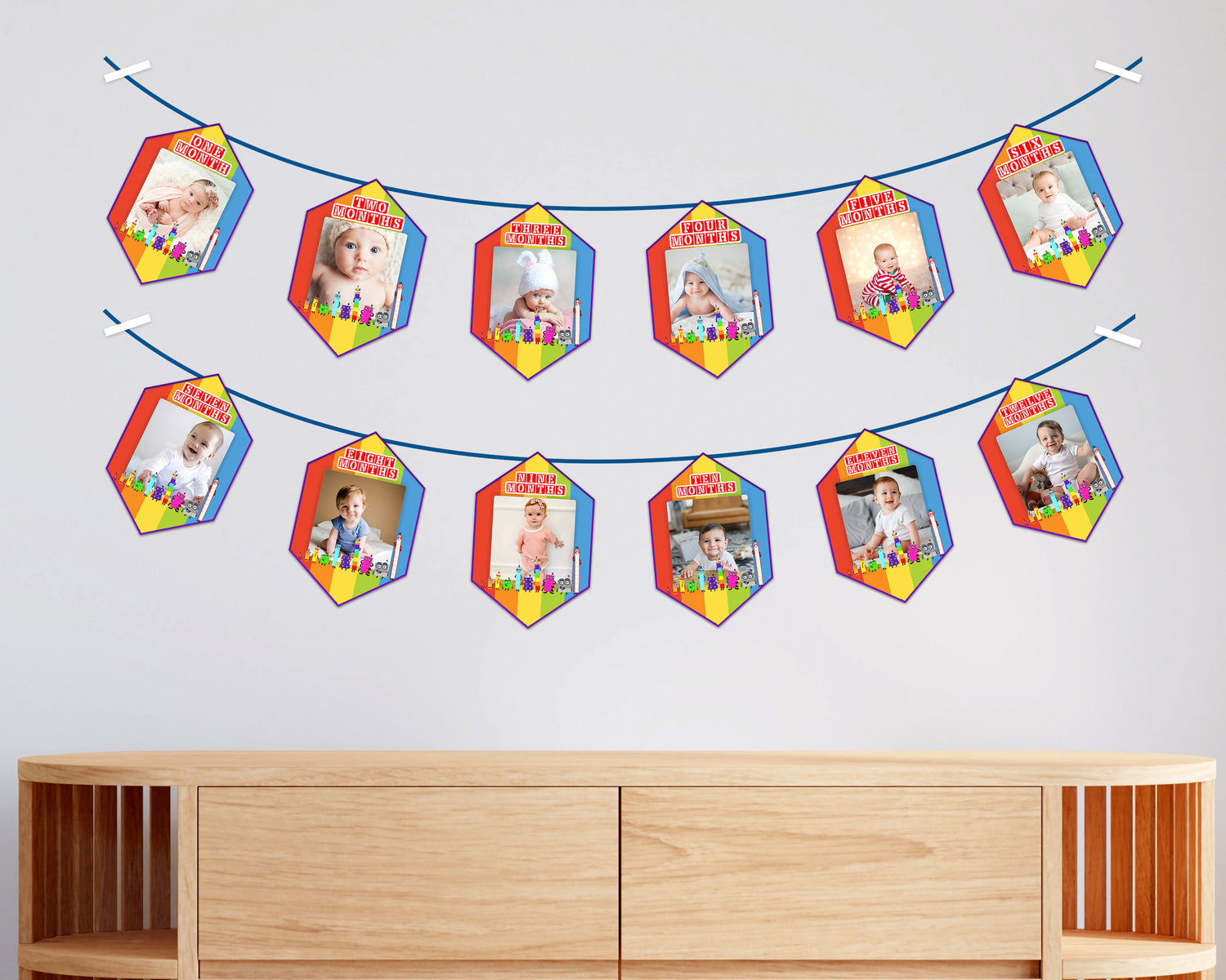 The Number Blocks theme based photo banner is perfect decoration for baby's 1st birthday party. It’s an eye-catching birthday banner with beautiful color, especially with lovely photos of your baby on it which is a special way to bringing a unforgettable and memorable party. This 12 Months Birthday Banner is made of 225 GSM quality Art board material. This package contains 1 set photo banner with ribbon. Size of each month banner will be 6 inches of width and 9 inches of height.