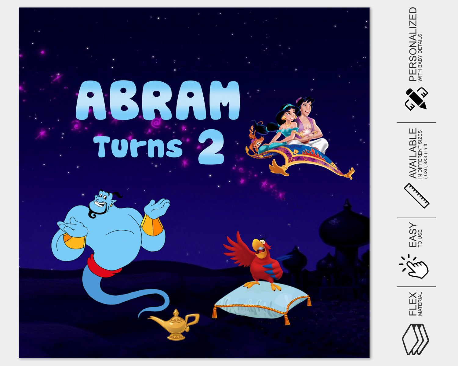 This Aladdin theme based Square Backdrop can be personalized with your baby details. You can share the baby details in form provided below. It comes with different variant sizes.