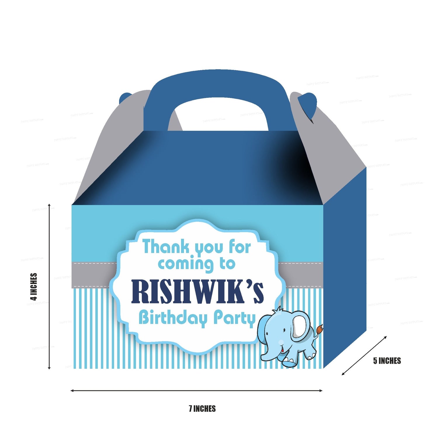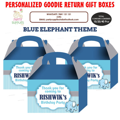 Colorful and Blue Elephant theme based Goodie return gift boxes personalized with baby name for take away gifts for guests. Made of 225 GSM quality Art board material to withstand up to 200g to 400g of weight. This boxes can be used to gift items like Chocolates, Cookies, Cup cakes, etc..