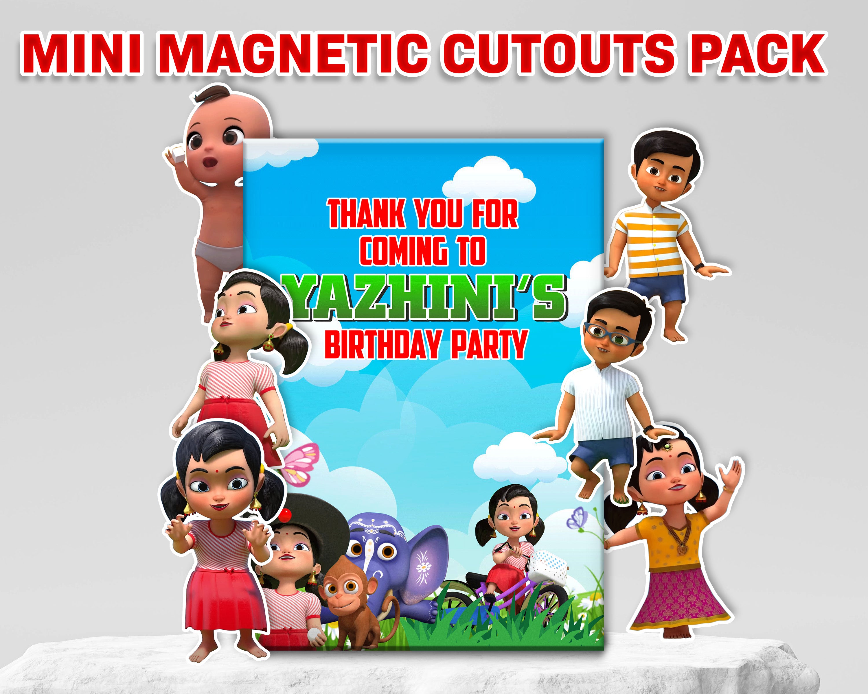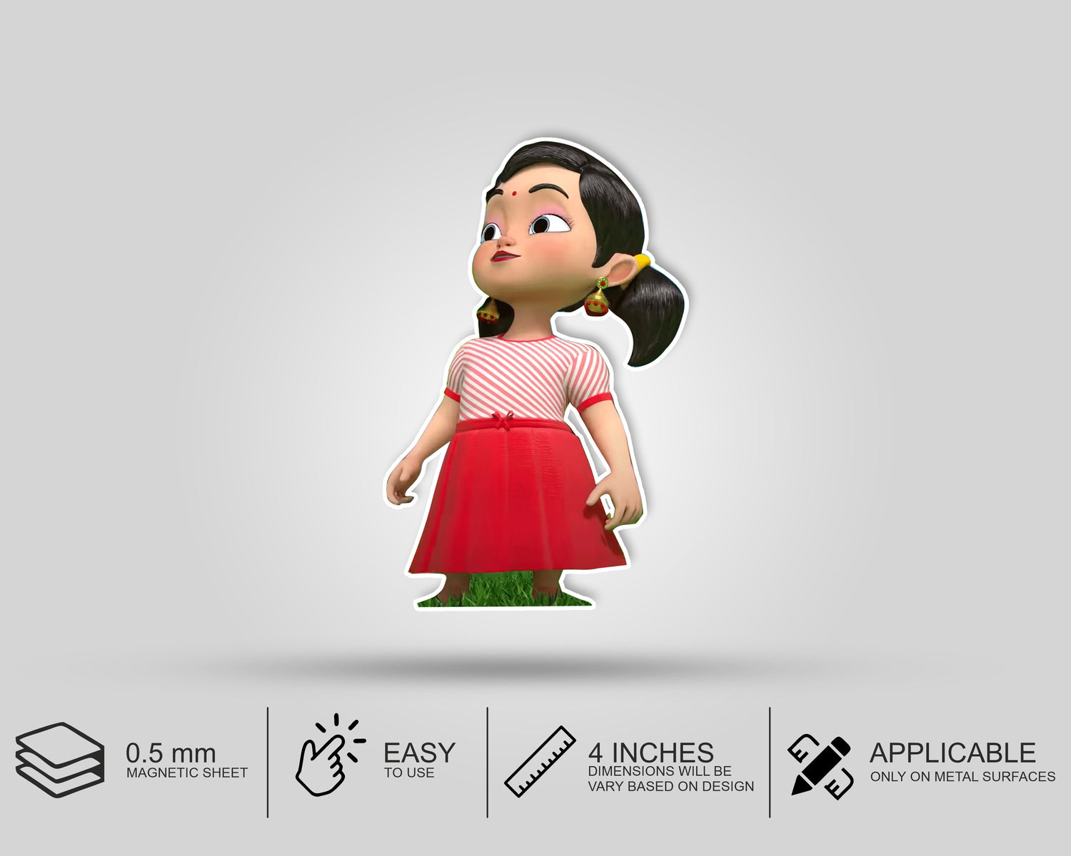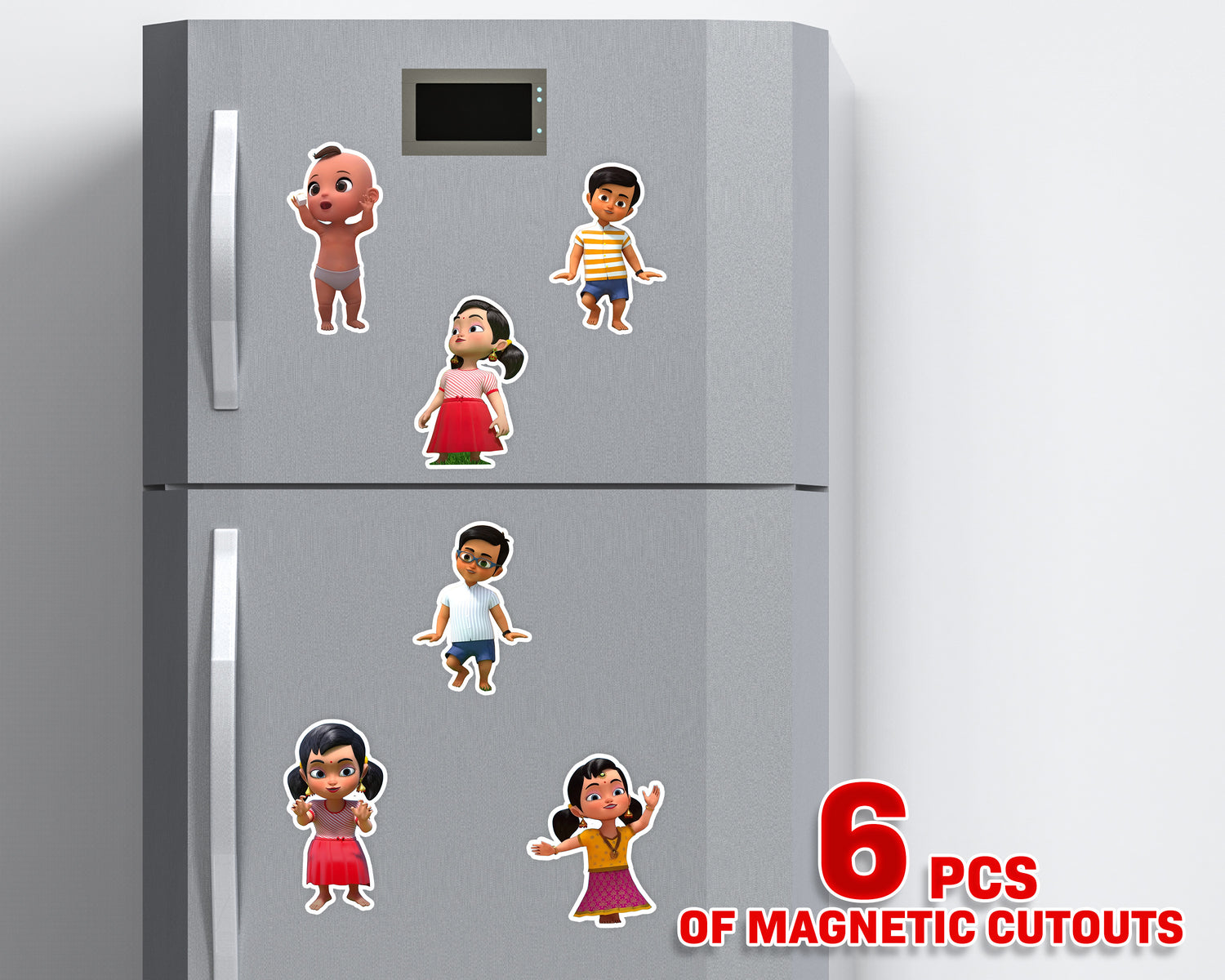 All stickers have a magnetic backing, ensuring they won't fall off easily and perfect for theme based return gifts. 1 Quantity represents a single pouch set which includes 6 magnetic stickers, each with a size of at least 4 inches in either height or width, depending on the design.