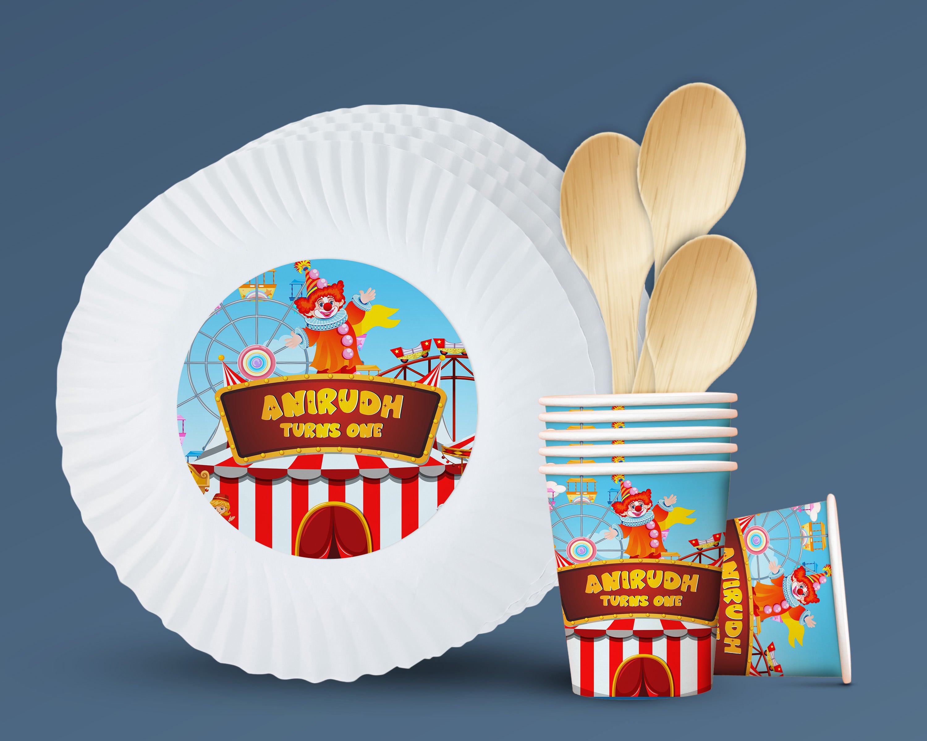Printed party cups, plates, and plain spoon combo birthday party supplies for themed parties are available with us. They are disposable and made of eco-friendly materials. Our plates are made of thick paper, with theme-based customization including baby details added, designed, printed, and pasted onto the plates and cups as shown in the reference images. They will be available only in combo sets in the below-mentioned variants.