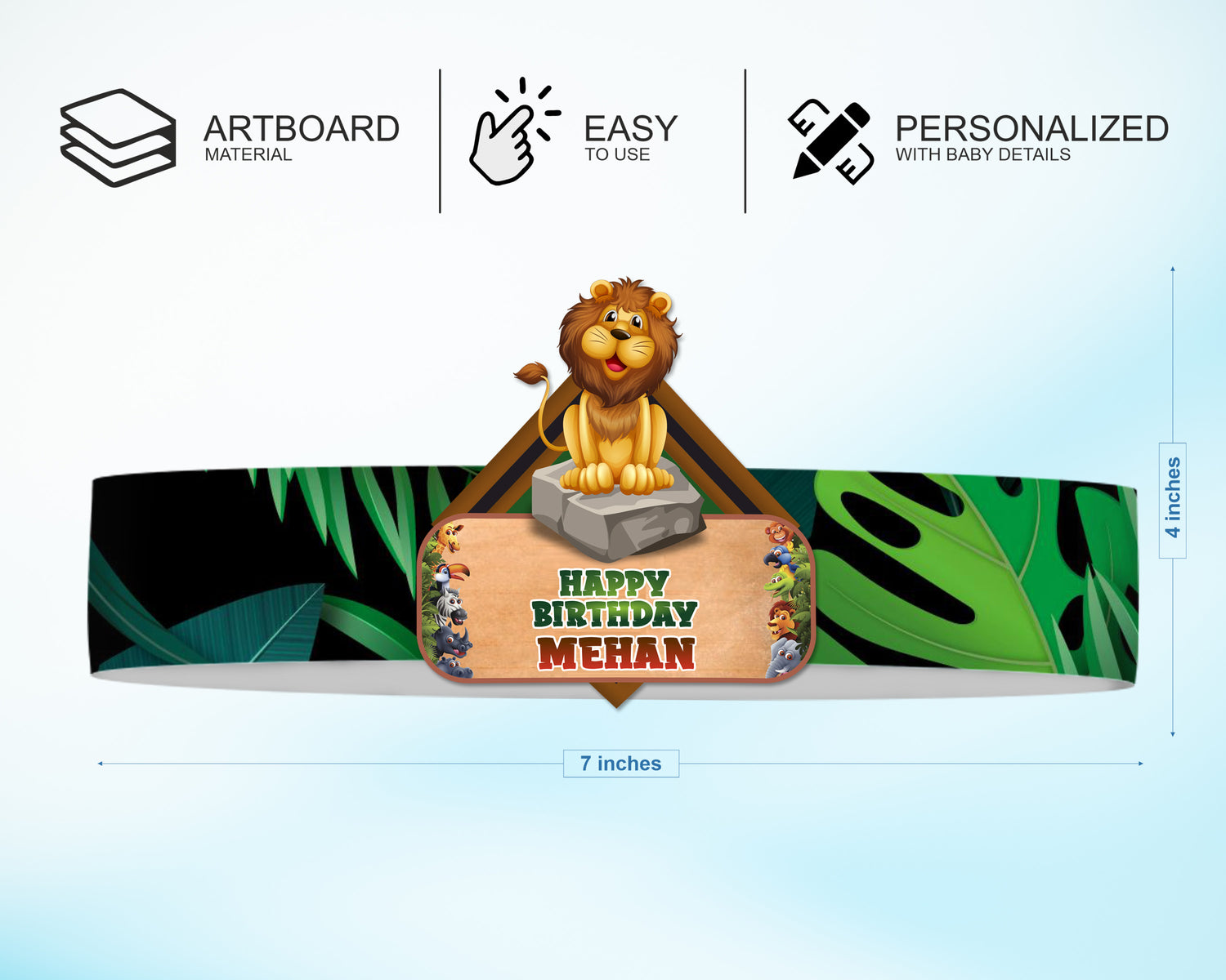 A personalized crown hat based on the Jungle theme, made of thick paperboard material, is ideal for celebrating kids' birthday parties.