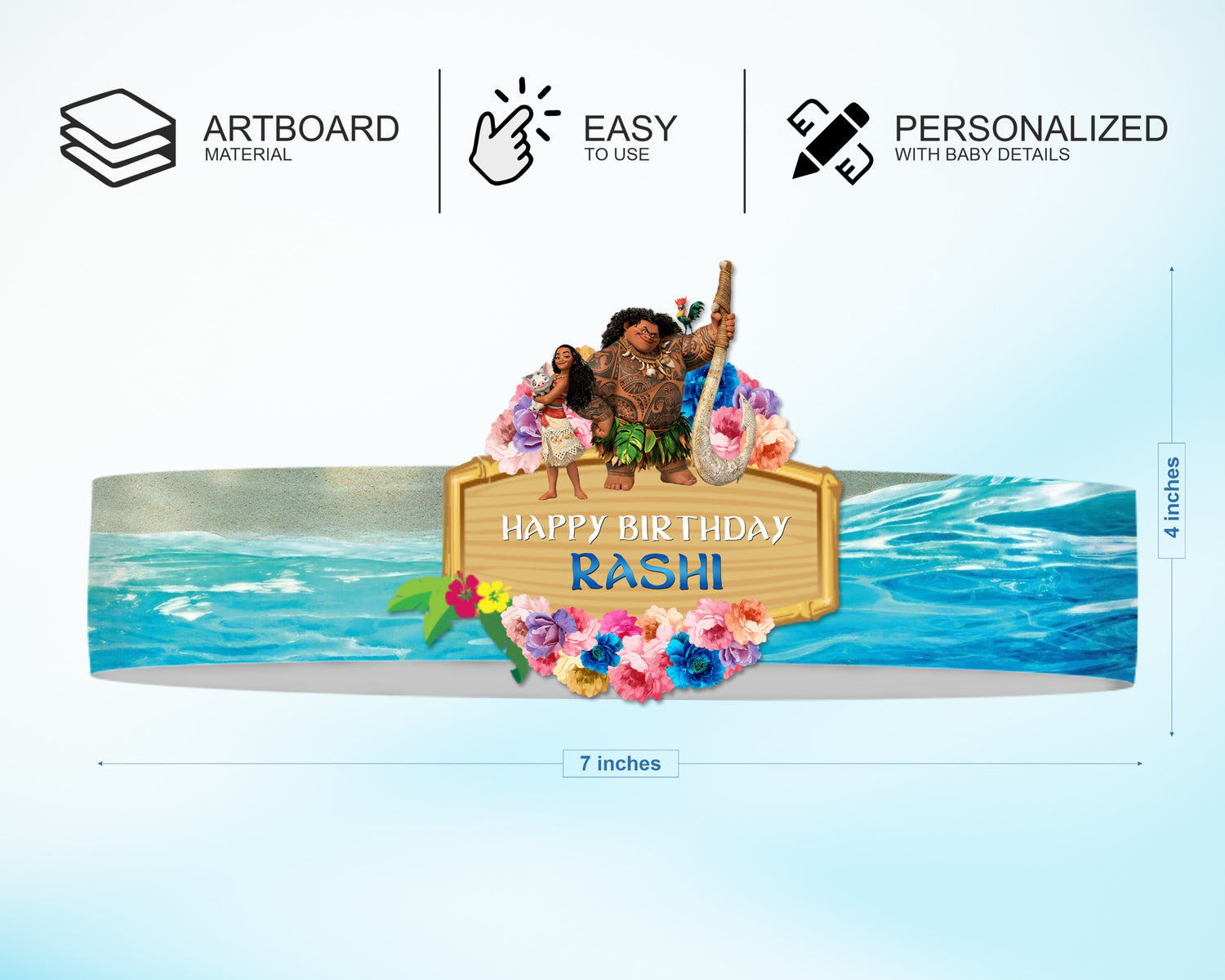 A personalized crown hat based on the Moana theme, made of thick paperboard material, is ideal for celebrating kids' birthday parties.