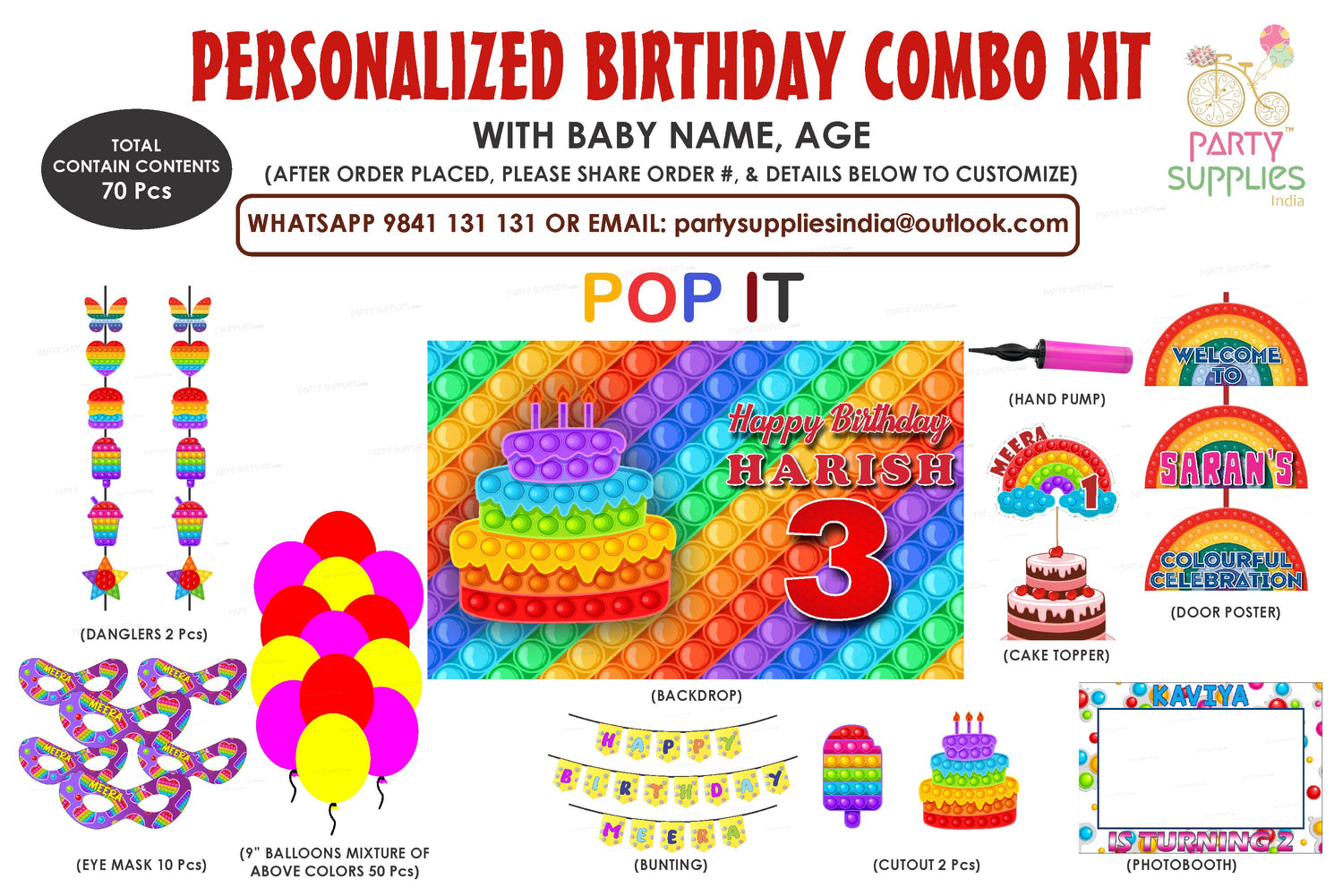 Pop It Theme combo kits will make celebrating your fun moments and there be a perfect combo products to create a memorable day and amazing experience, yourself and your family Add a perfect touch to your kids party with our beautiful customized party combo
