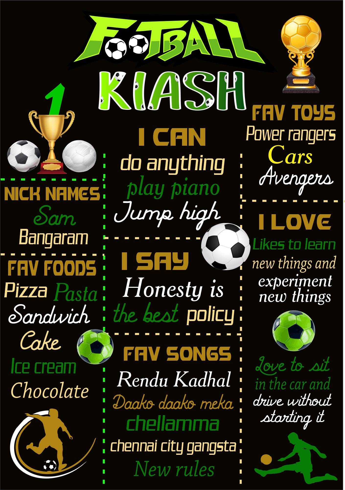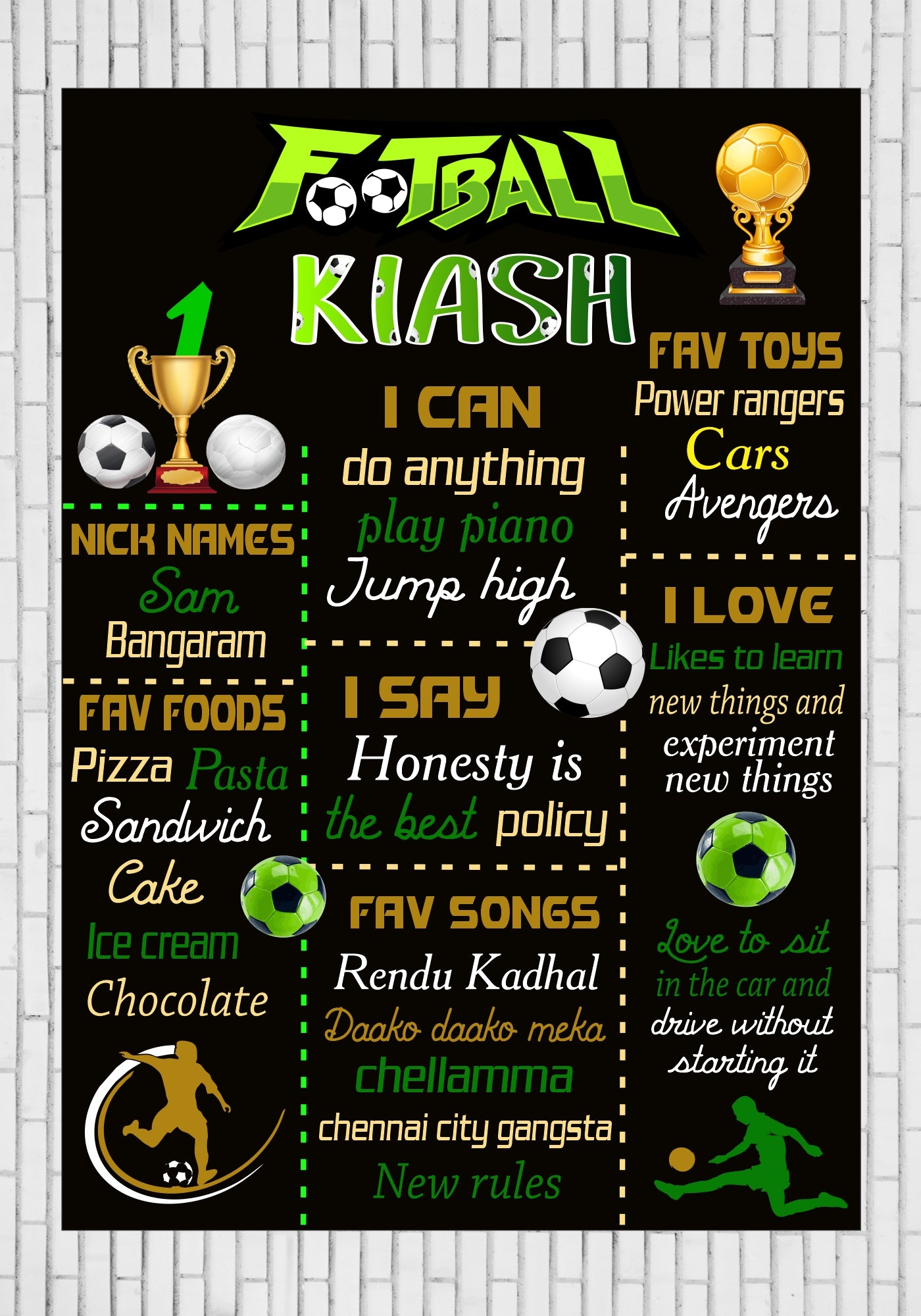 Chalk Board is a great way of cherishing the baby's likes, the milestones in their growth. A Chalk board would be a gift for your kid forever. Based on the Football theme, you can help us customize it with fine details.