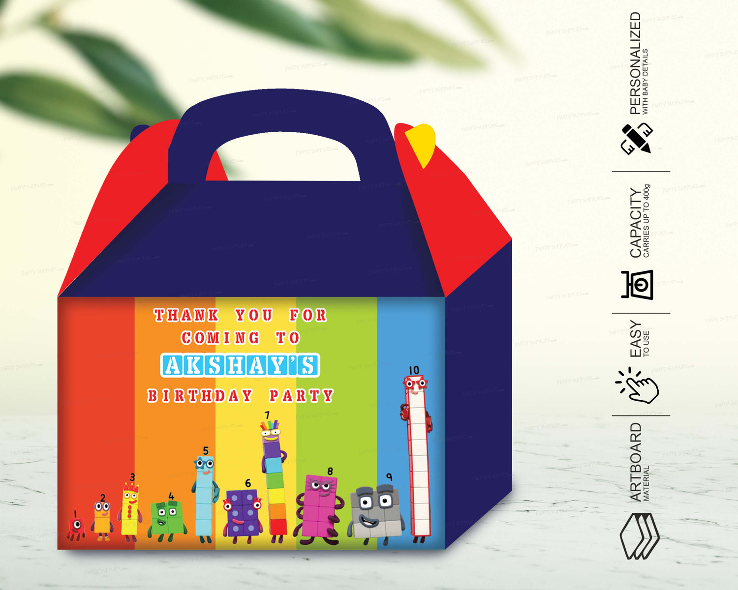 Colorful and Number Blocks theme based Goodie return gift boxes personalized with baby name for take away gifts for guests. Made of 225 GSM quality Art board material to withstand up to 200g to 400g of weight. This boxes can be used to gift items like Chocolates, Cookies, Cup cakes, etc..
