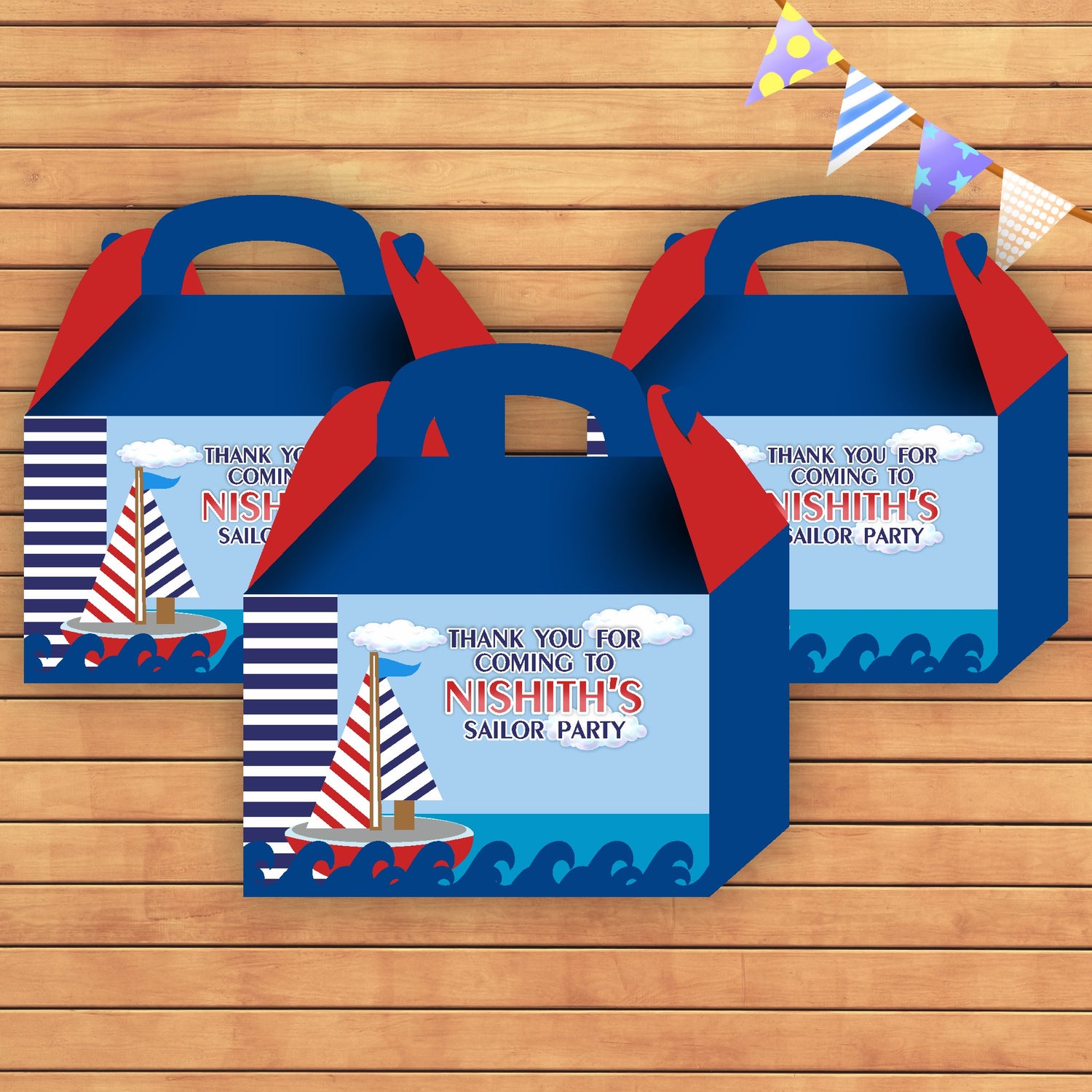 Colorful and Sailor theme based Goodie return gift boxes personalized with baby name for take away gifts for guests. Made of 225 GSM quality Art board material to withstand up to 200g to 400g of weight. This boxes can be used to gift items like Chocolates, Cookies, Cup cakes, etc..