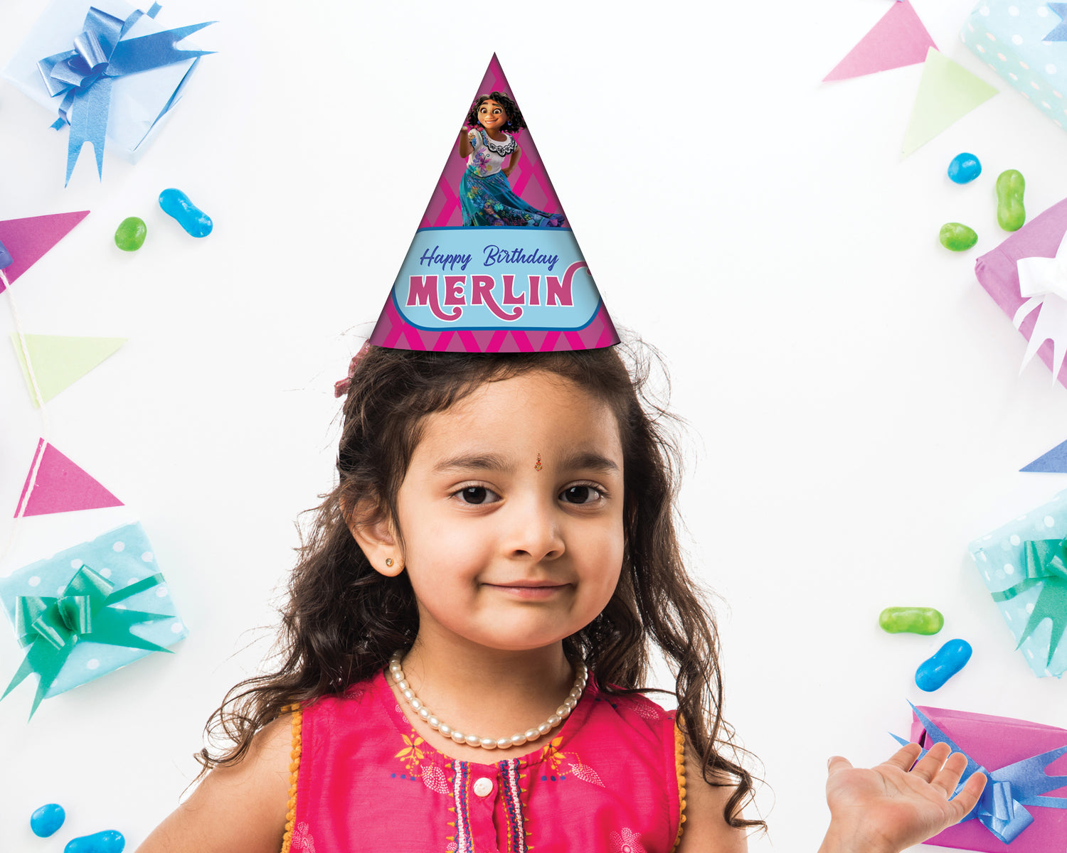 Highlight your look with our dazzling Encanto theme hat. Package includes 5 - 10 Hats, each with an attached elastic string.