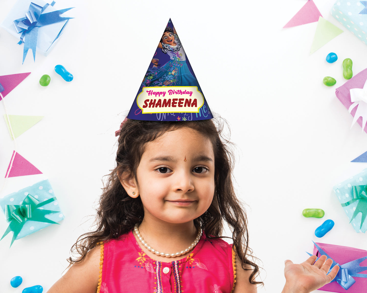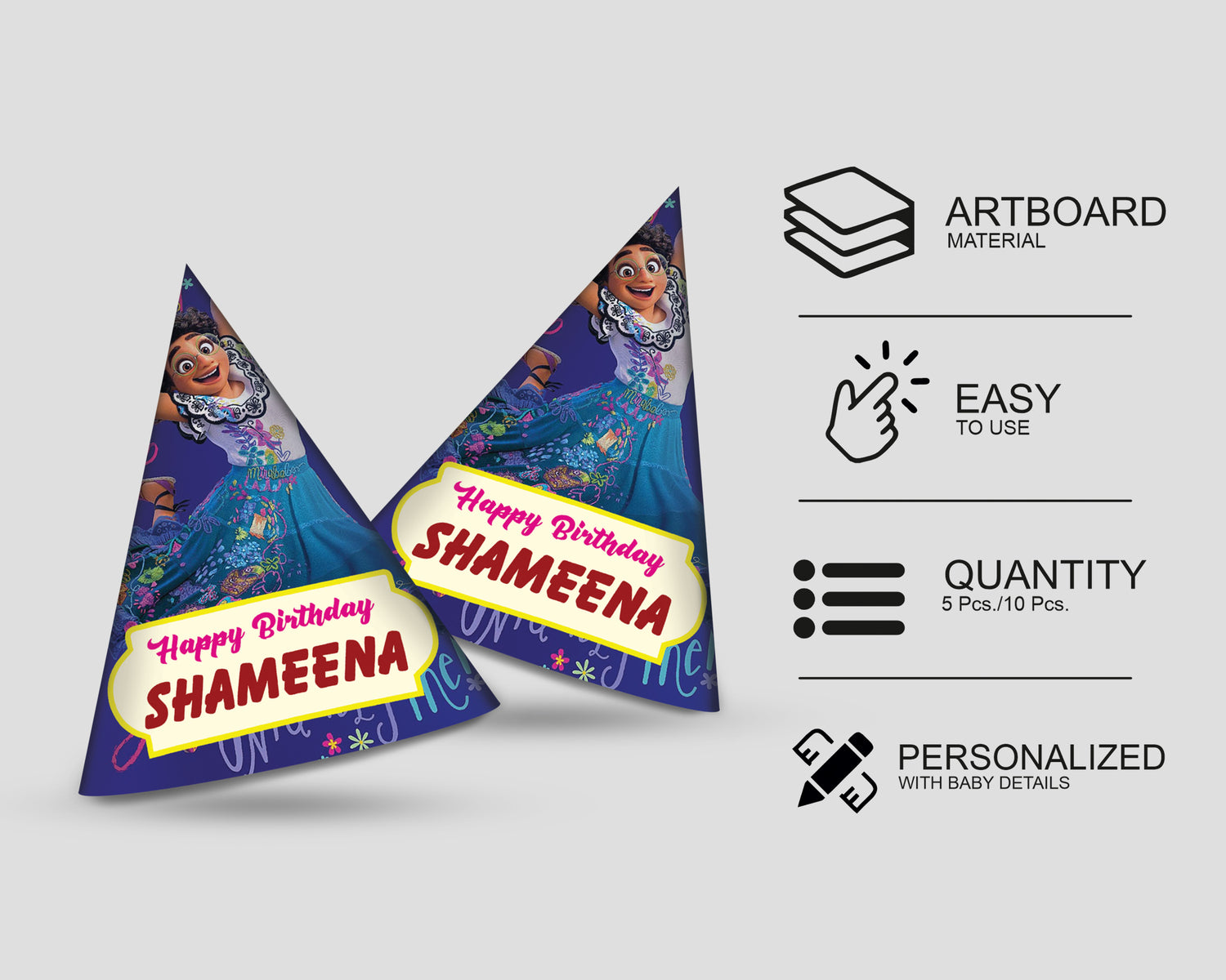 Highlight your look with our dazzling Encanto theme hat. Package includes 5 - 10 Hats, each with an attached elastic string.