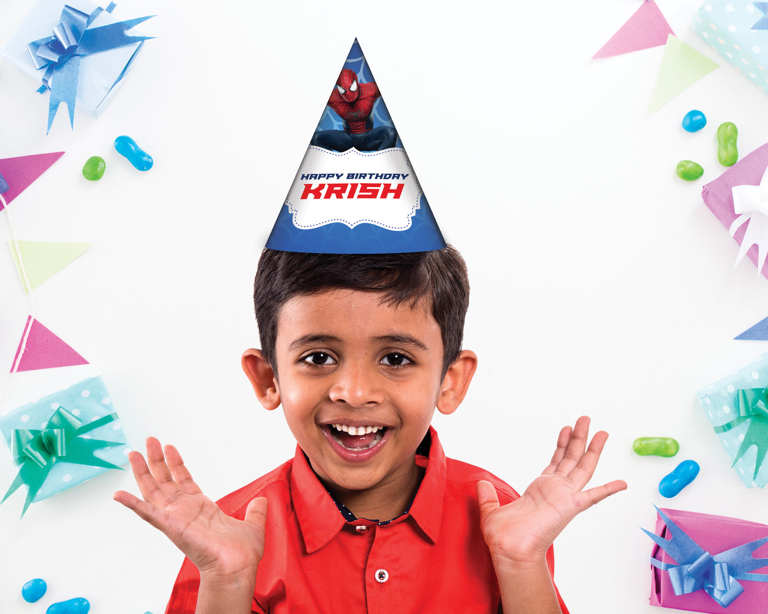 Spiderman Theme personalized hat is easy to find reliable cherish about for kids birthday party event for happy moment. The package includes 5 - 10 Hats, each with an attached elastic string.