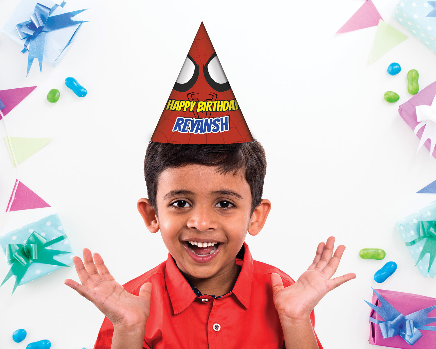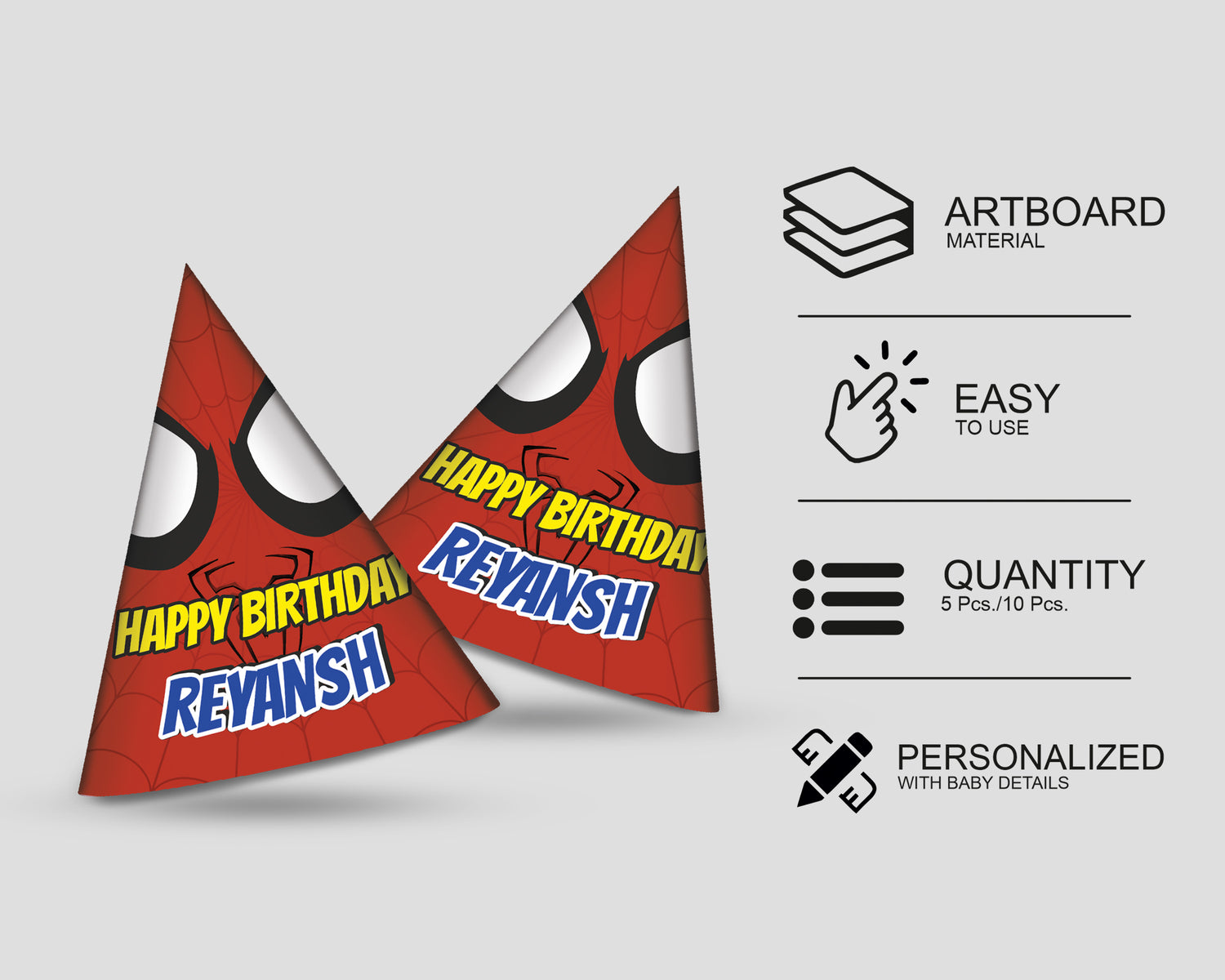 Spiderman Theme personalized hat is easy to find reliable cherish about for kids birthday party event for happy moment. The package includes 5 - 10 Hats, each with an attached elastic string.