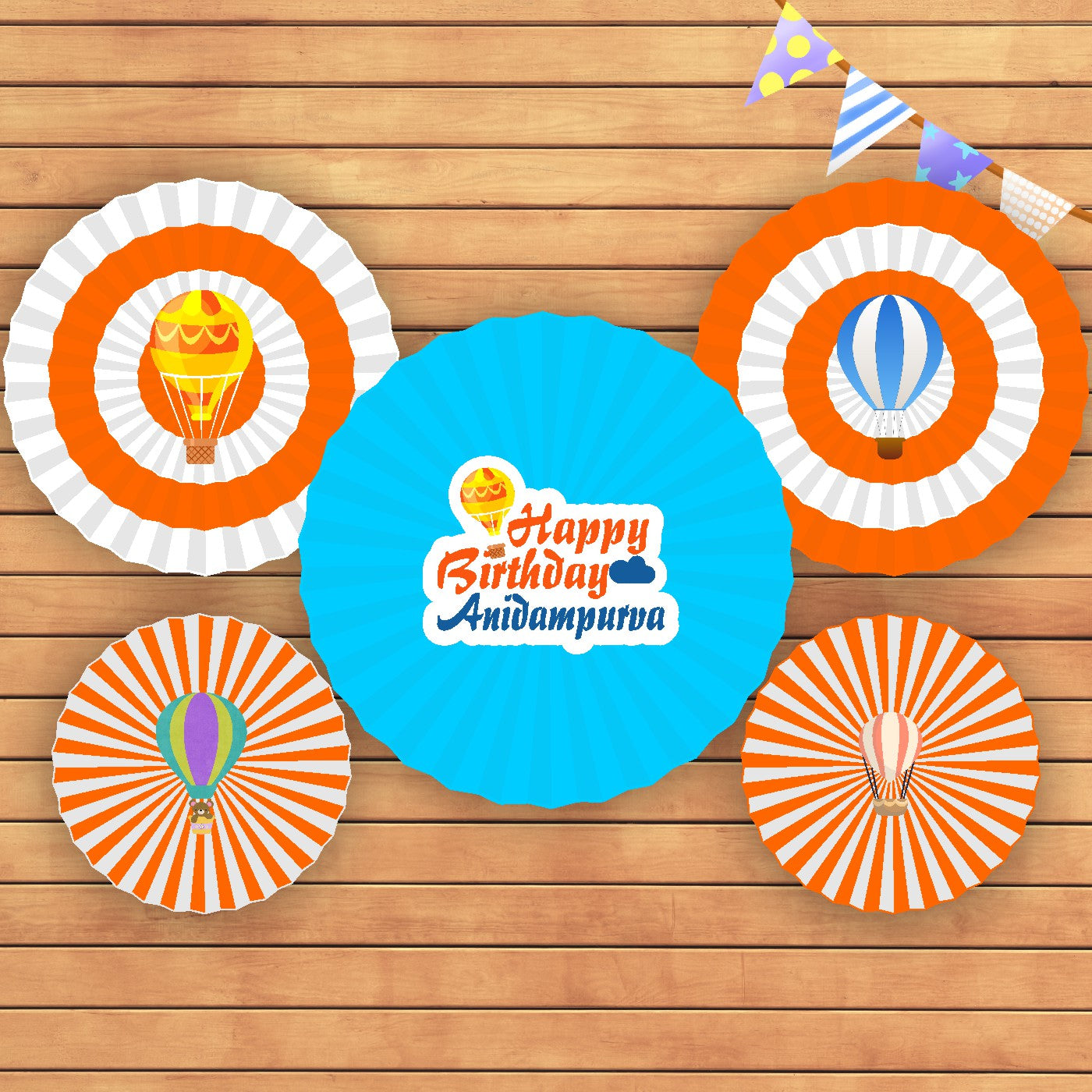 Hot Air Boy Theme Based Paper Fan with related characters placed at the centre which is mainly used for Birthday Party Decorations and made of quality chart material. Quantity - Pack of 5 Pcs. (1 Quantity of 16 Inches, 2 Quantity of 12 Inches, 2 Quantity of 8 Inches) 2 Minutes Setting-up process 1. Unpack and make it to paper fan shape. 2. Remove the red glue tape and paste it. 3. Stick the characters provided in the centre of paper fan using the double side tape provided at the backside of character.