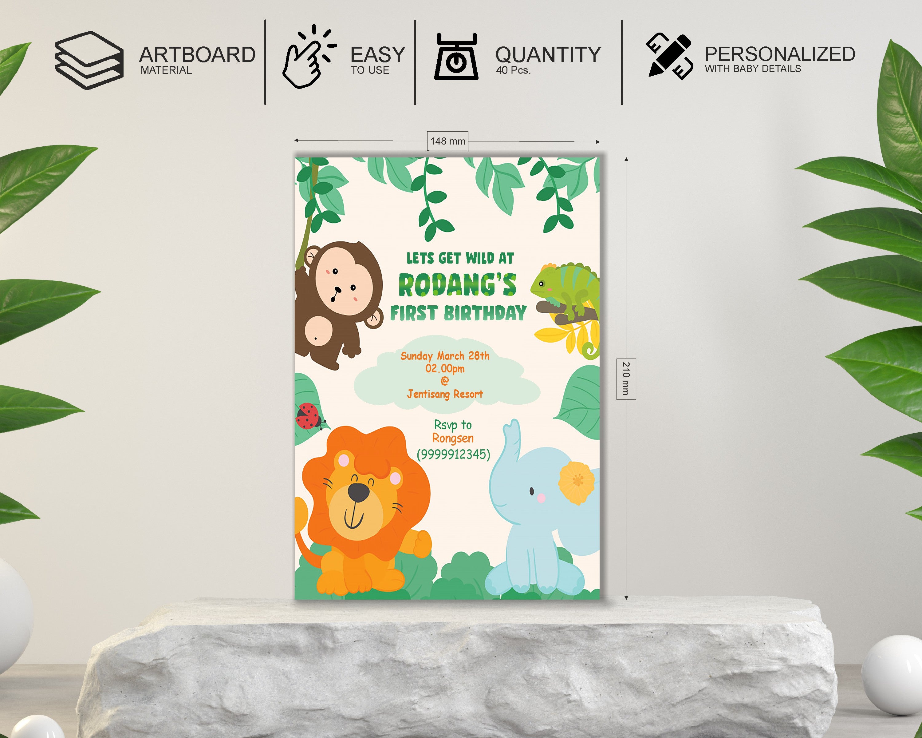 Planning on a jungle theme for your baby shower or birthday party? These adorable invitations feature greenery, an elephant, a monkey and a lion. Since the invite is customized and printed in-house we do not provide envelop.
