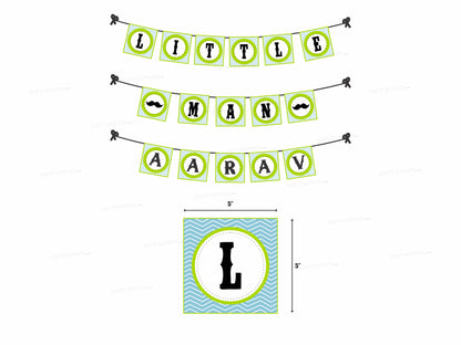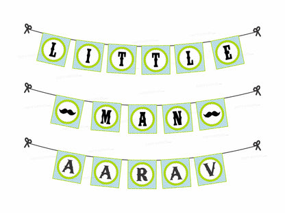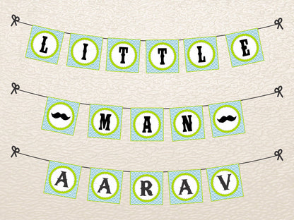 The Happy Birthday hanging that goes well with the Little Man theme can be strung anywhere across the room to add to the vibes.