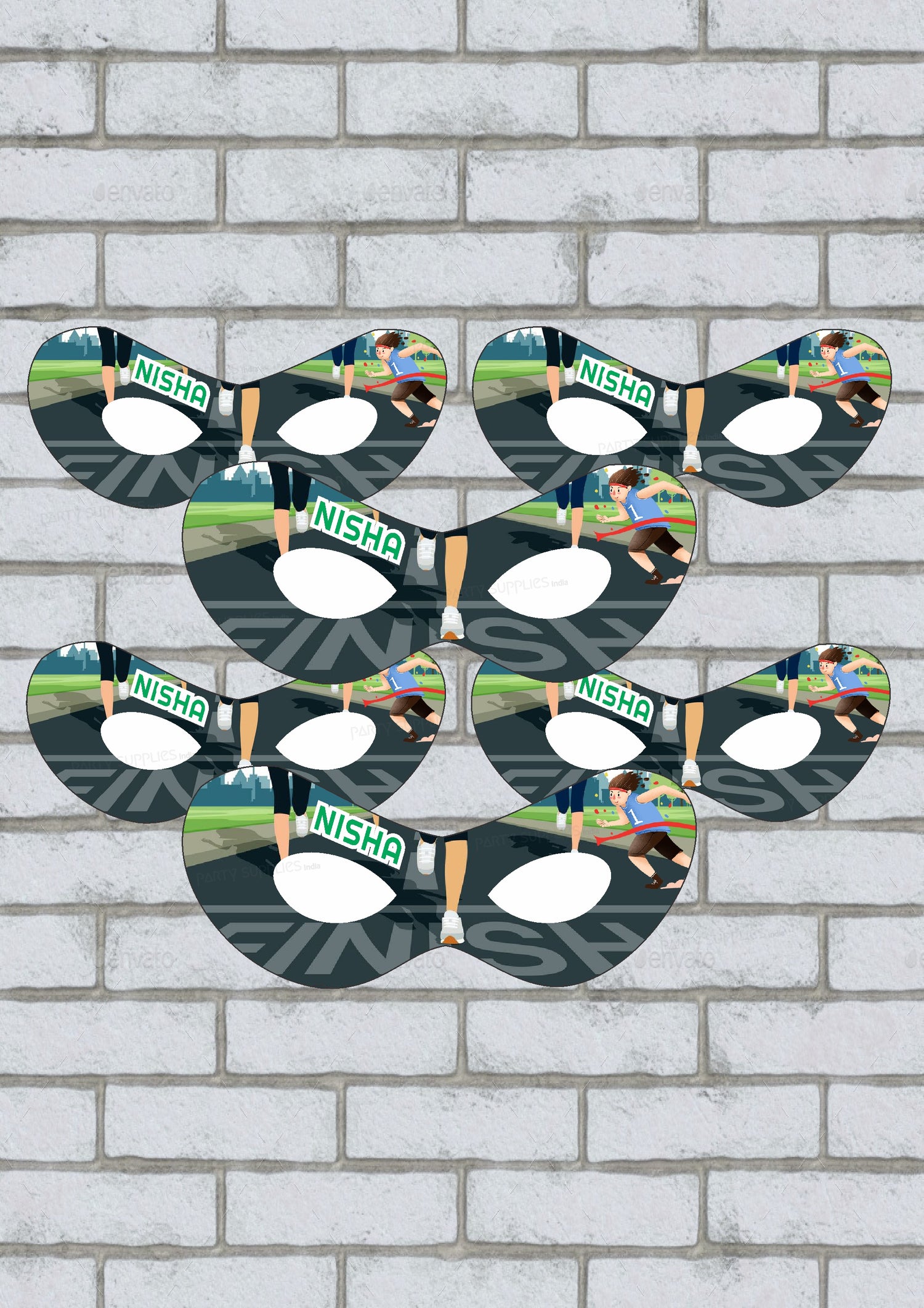 Highlight your look with our Marathon theme eye mask. Package includes 5 - 10 Masks, each with an attached elastic string and cutout holes for eyes.
