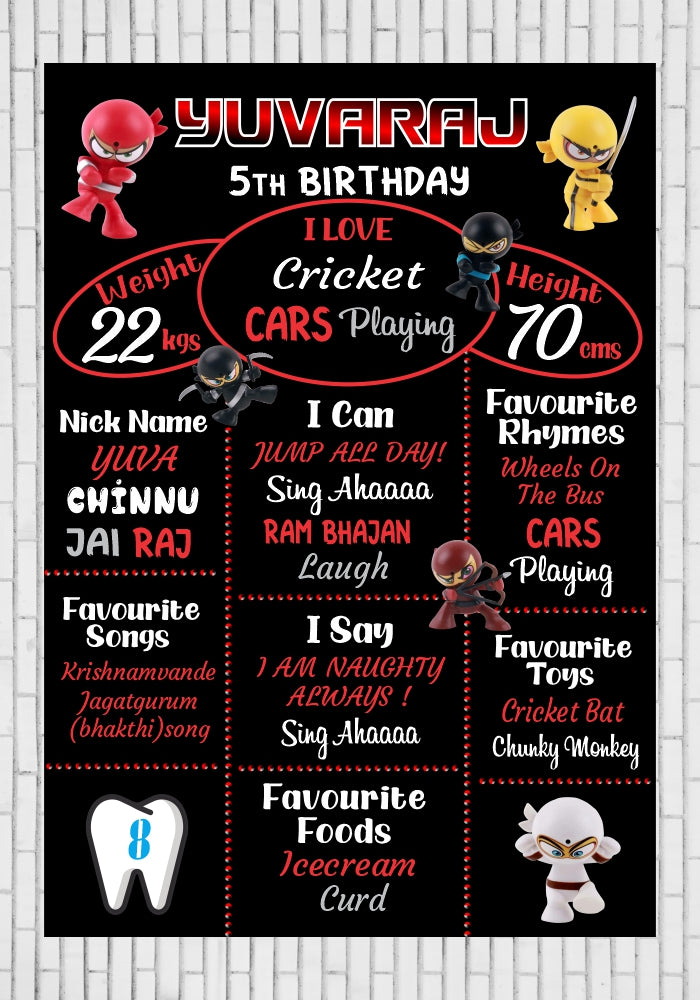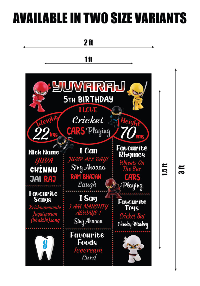Chalk Board is a great way of cherishing the baby's likes, the milestones in their growth. A Chalk board would be a gift for your kid forever. Based on the Ninja theme, you can help us customize it with fine details. You can also choose the pictures .Personalized birthday chalkboard posters made of foam board. Custom printed with the info about your child provided in the form provided.