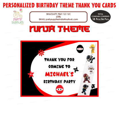 Birthday parties are fun! Send your birthday party memories in style with our theme based Ninja Thank you Cards personalized with baby name. Made of 225 GSM quality Art board material. Size will be 6x4 inches. It comes with different variants in quantity (18 Pcs. & 36 Pcs.)