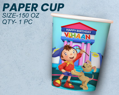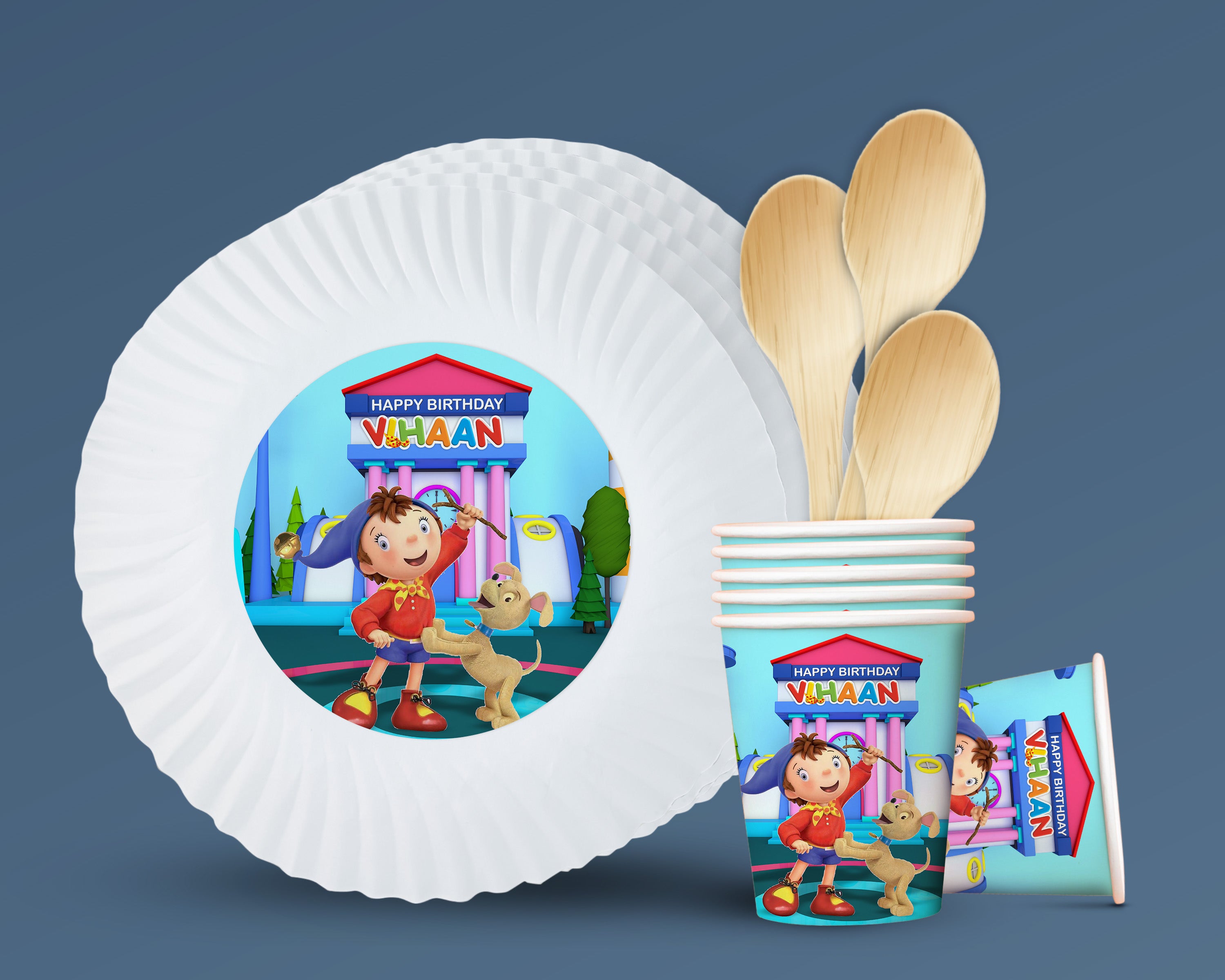 Printed party cups, plates, and plain spoon combo birthday party supplies for themed parties are available with us. They are disposable and made of eco-friendly materials. Our plates are made of thick paper, with theme-based customization including baby details added, designed, printed, and pasted onto the plates and cups as shown in the reference images. They will be available only in combo sets in the below-mentioned variants.