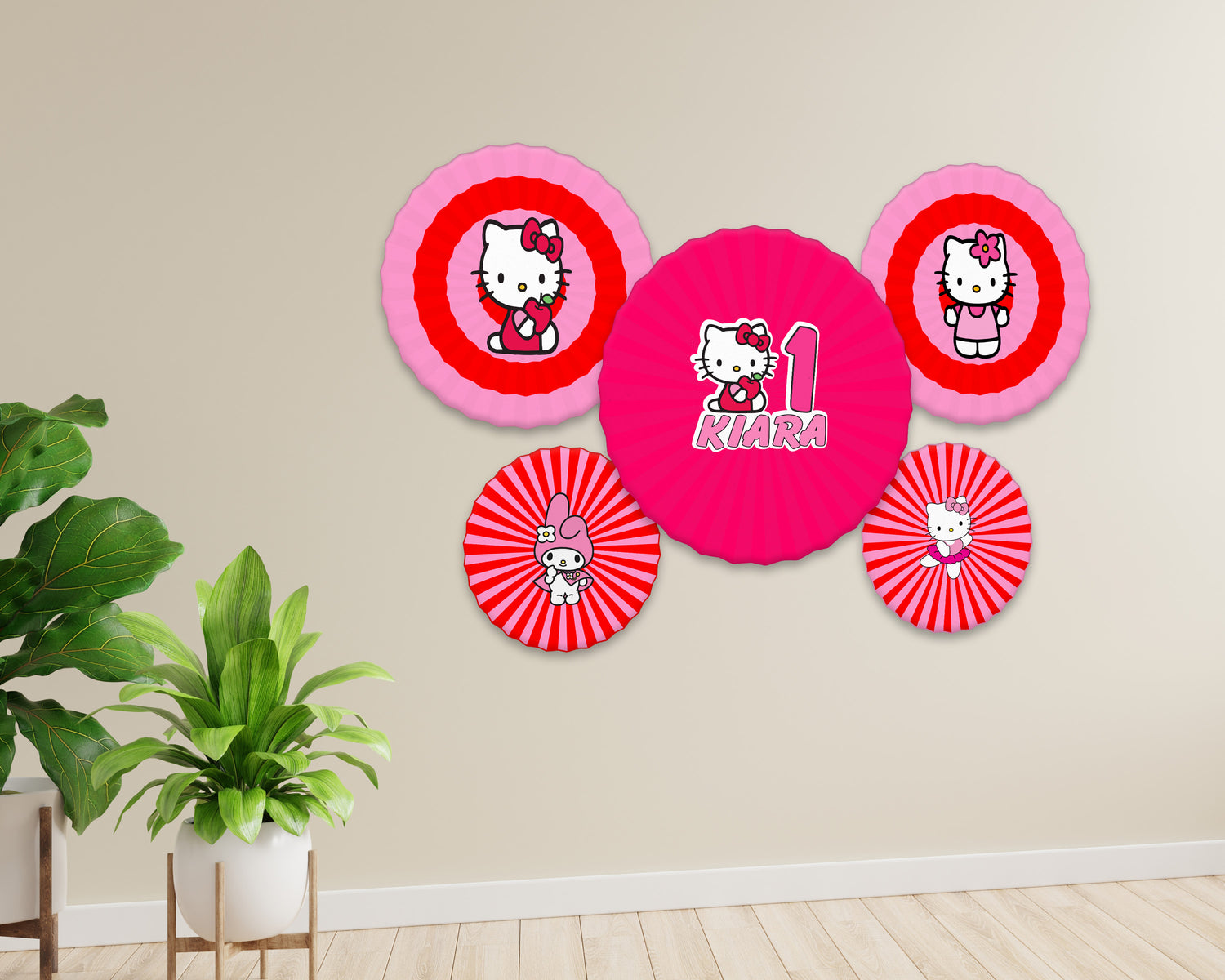 Hello Kitty Theme Based Paper Fan with related characters placed at the centre which is mainly used for Birthday Party Decorations and made of quality chart material. Quantity - Pack of 5 Pcs. (1 Quantity of 16 Inches, 2 Quantity of 12 Inches, 2 Quantity of 8 Inches) 2 Minutes Setting-up process 1. Unpack and make it to paper fan shape. 2. Remove the red glue tape and paste it. 3. Stick the characters provided in the centre of paper fan using the double side tape provided at the backside of character.