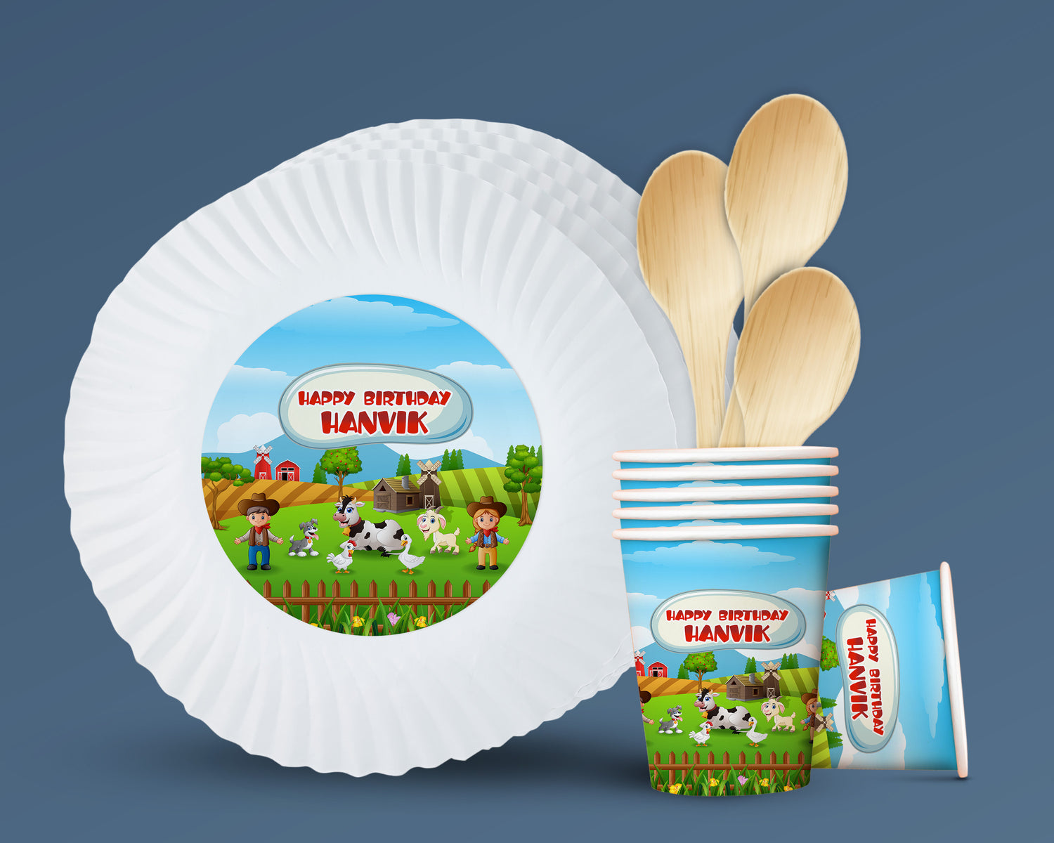Printed party cups, plates, and plain spoon combo birthday party supplies for themed parties are available with us. They are disposable and made of eco-friendly materials. Our plates are made of thick paper, with theme-based customization including baby details added, designed, printed, and pasted onto the plates and cups as shown in the reference images. They will be available only in combo sets in the below-mentioned variants.