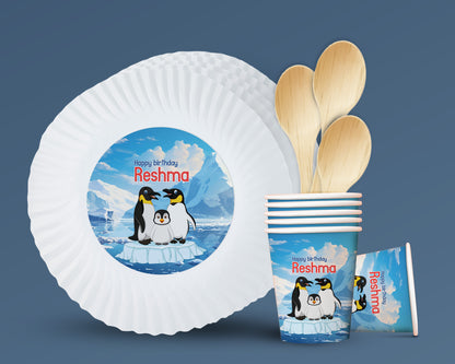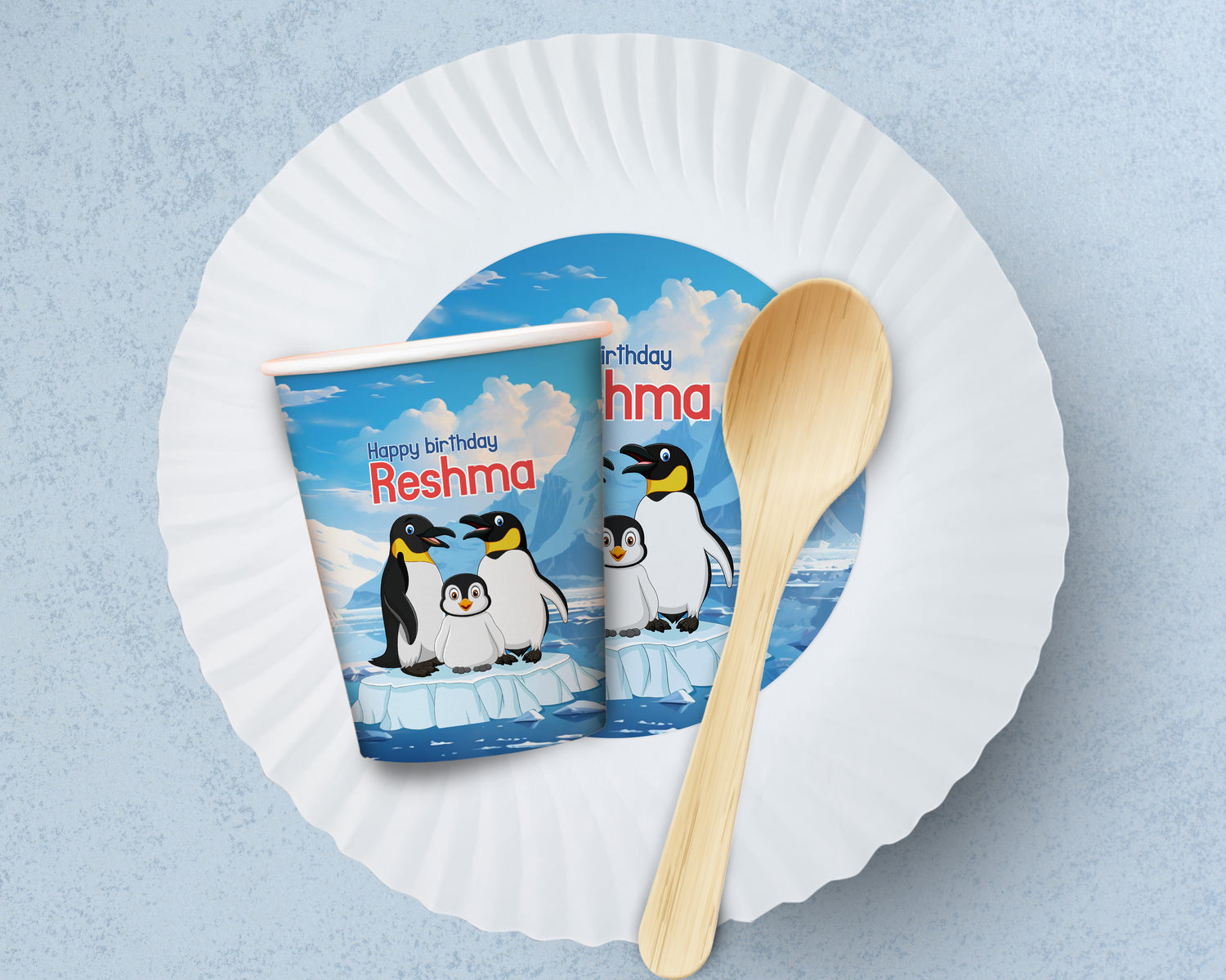Printed party cups, plates, and plain spoon combo birthday party supplies for themed parties are available with us. They are disposable and made of eco-friendly materials. Our plates are made of thick paper, with theme-based customization including baby details added, designed, printed, and pasted onto the plates and cups as shown in the reference images. They will be available only in combo sets in the below-mentioned variants.