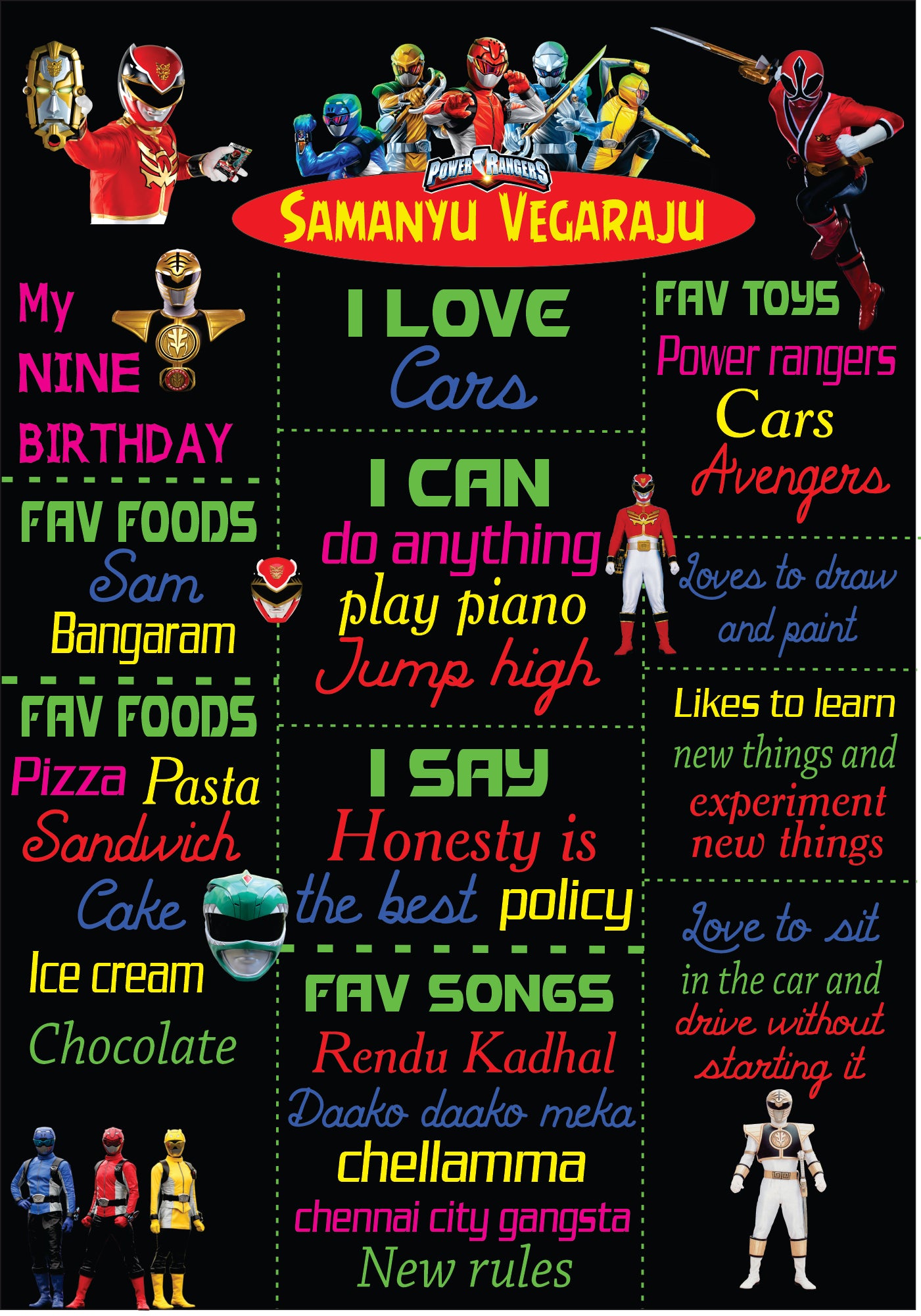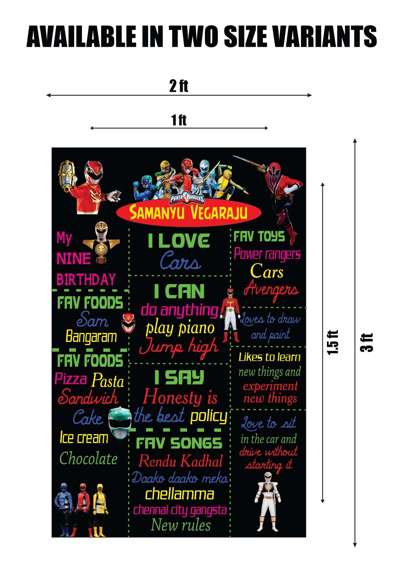 Chalk Board is a great way of cherishing the baby's likes, the milestones in their growth. A Chalk board would be a gift for your kid forever. Based on the Power Rangers theme, you can help us customize it with fine details. You can also choose the pictures .Personalized birthday chalkboard posters made of foam board. Custom printed with the info about your child provided in the form provided.