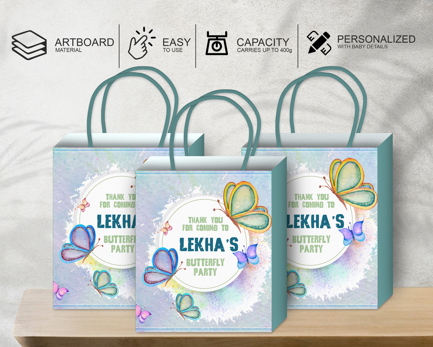 Colorful and Butterfly theme based return gift bag personalized with baby name for take away gifts for guests. Made of 225 GSM quality Art board material and it can withstand upto 400g to 600g of weight also will have satin ribbon at the top to hold it (Colour of satin ribbon will be based on availability).