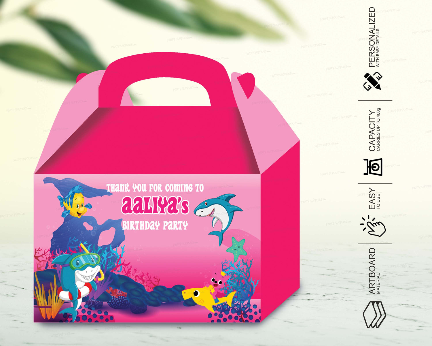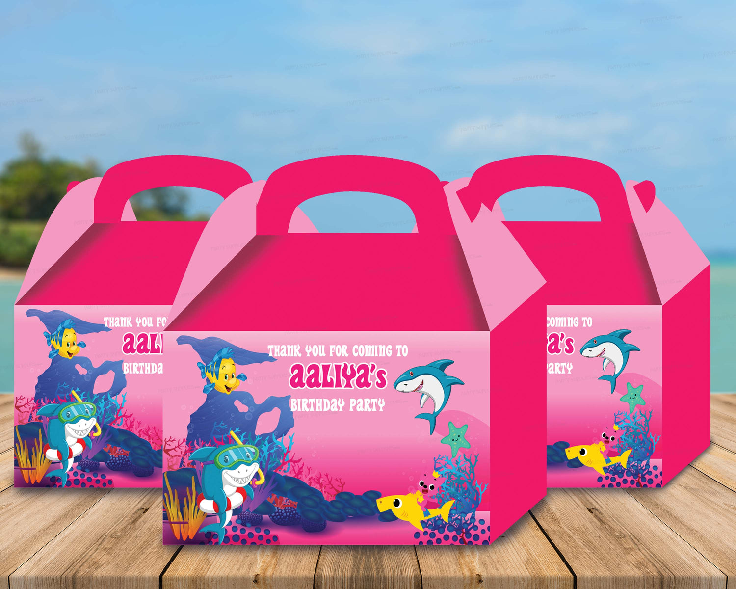 Colorful and Shark Girl theme based Goodie return gift boxes personalized with baby name for take away gifts for guests. Made of 225 GSM quality Art board material to withstand up to 200g to 400g of weight. This boxes can be used to gift items like Chocolates, Cookies, Cup cakes, etc..