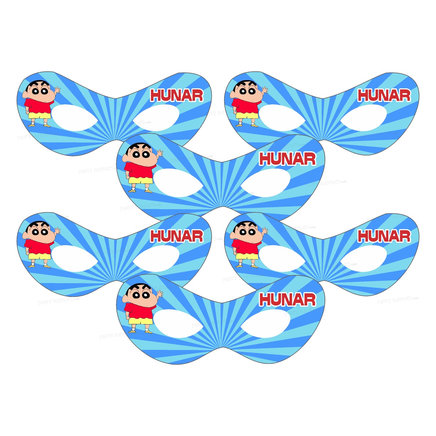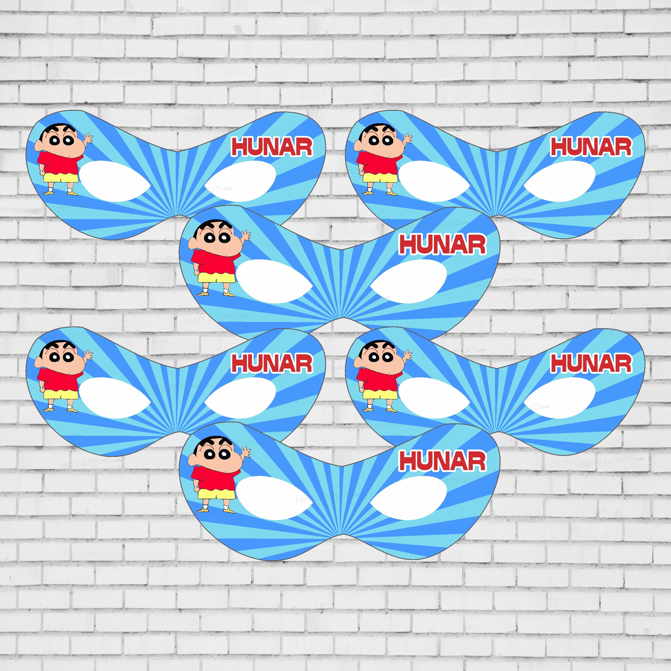 Highlight your look with our dazzling Shinchan theme mask. Place these masks in khoi bags for kids or lay out on your party table for a fun look! Package includes 5 Masks, each with an attached elastic string and cutout holes for eyes.
