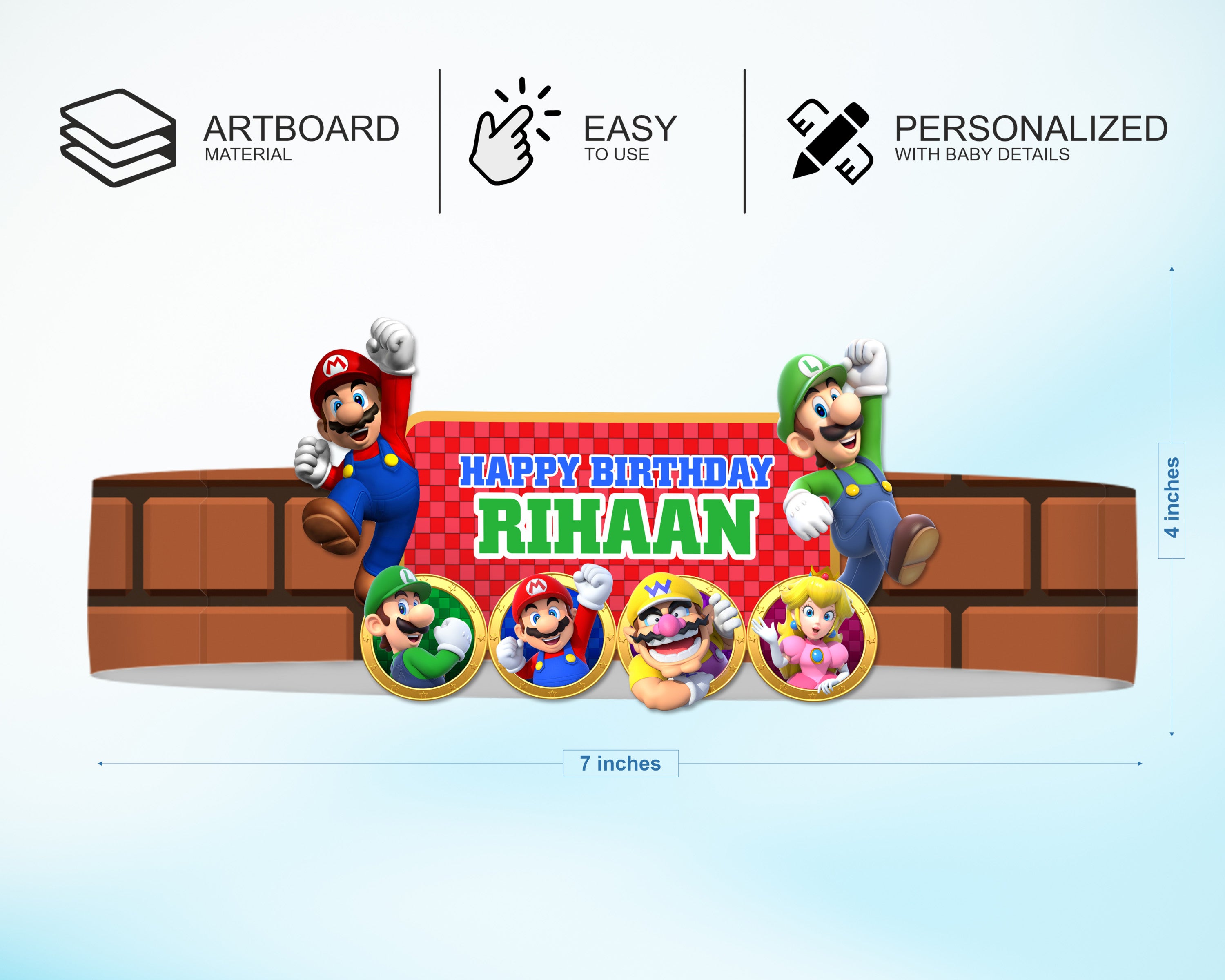 A personalized crown hat based on the Farm theme, made of thick paperboard material, is ideal for celebrating kids' birthday parties.This crown can be adjusted to fit both kids and adults using the adhesive strips and tape provided, by following the steps in the user guide.