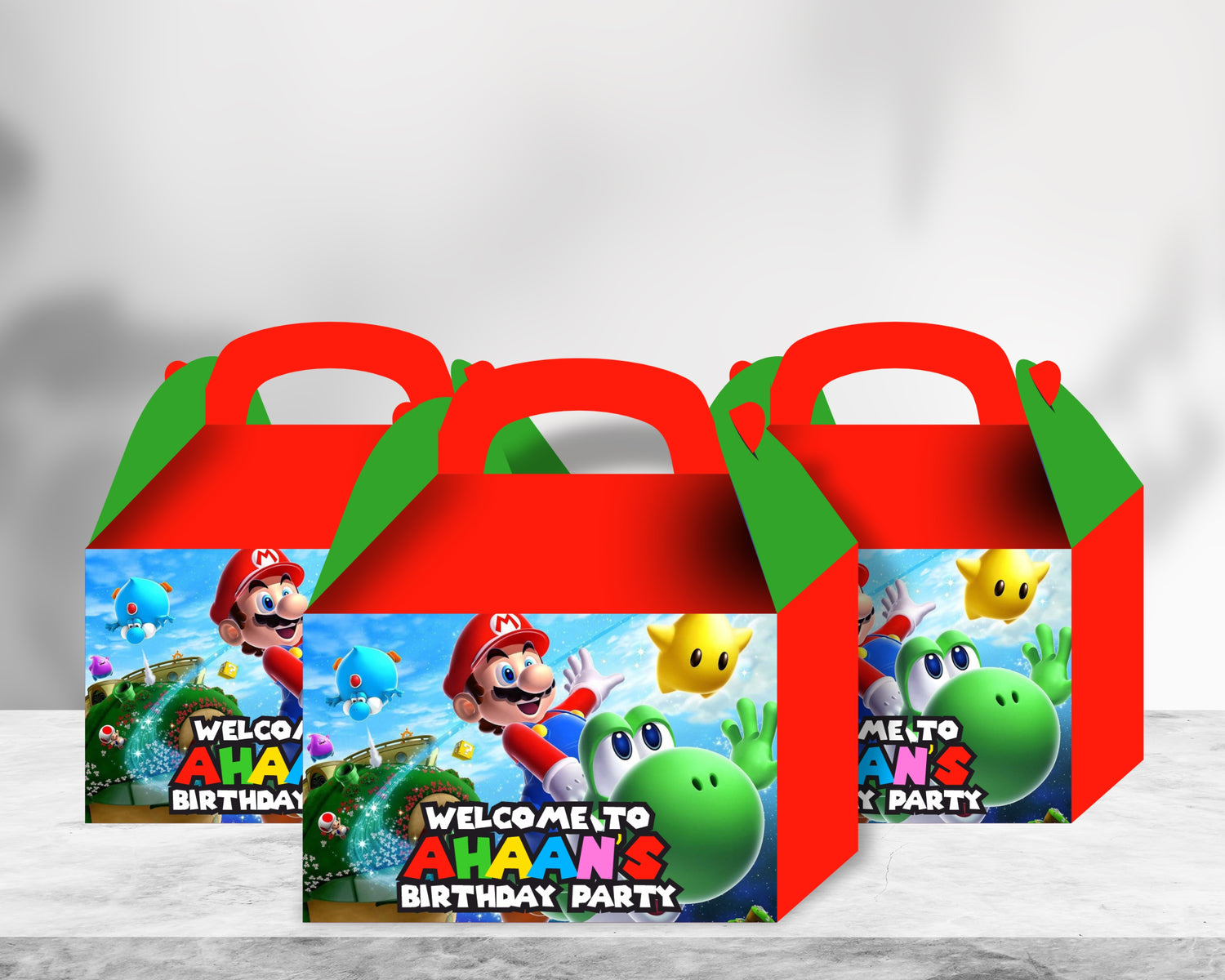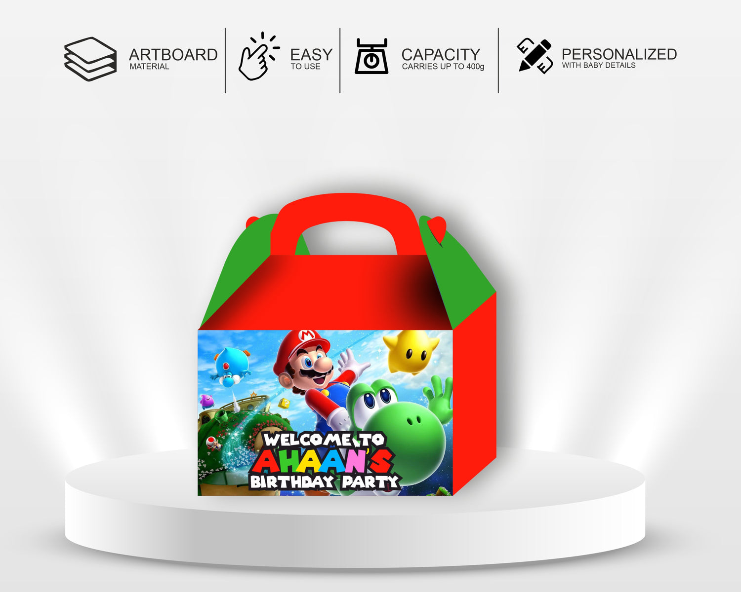 Colorful and Super Mario theme based Goodie return gift boxes personalized with baby name for take away gifts for guests. Made of 225 GSM quality Art board material to withstand up to 200g to 400g of weight. This boxes can be used to gift items like Chocolates, Cookies, Cup cakes, etc..