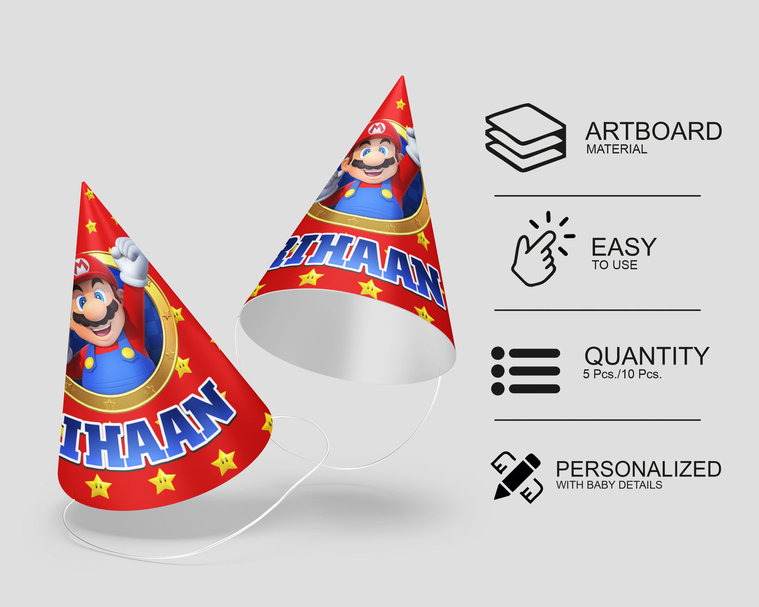 Super Mario Theme personalized hat is easy to find reliable cherish about for kids birthday party event for happy moment. The package includes 5 - 10 Hats, each with an attached elastic string.