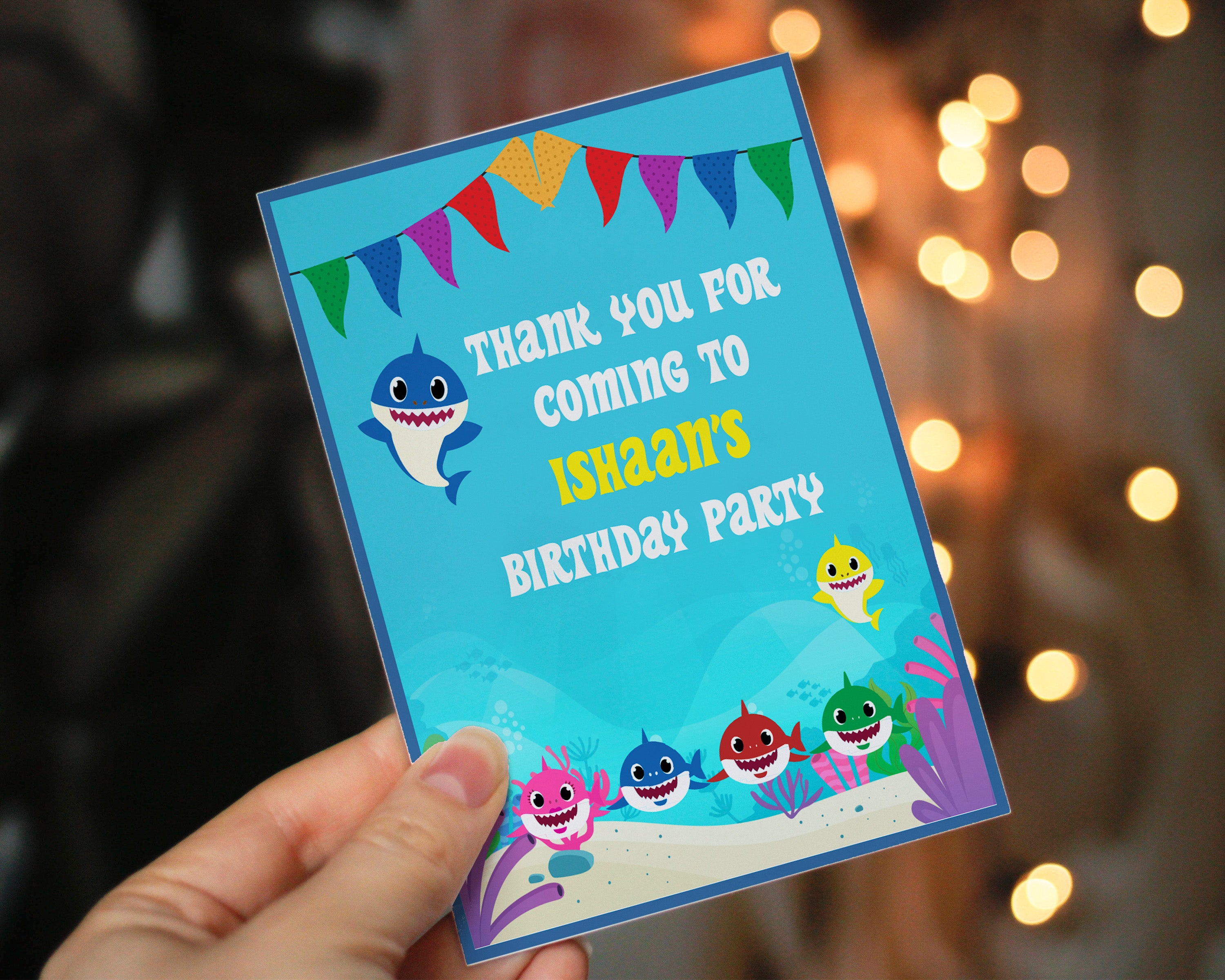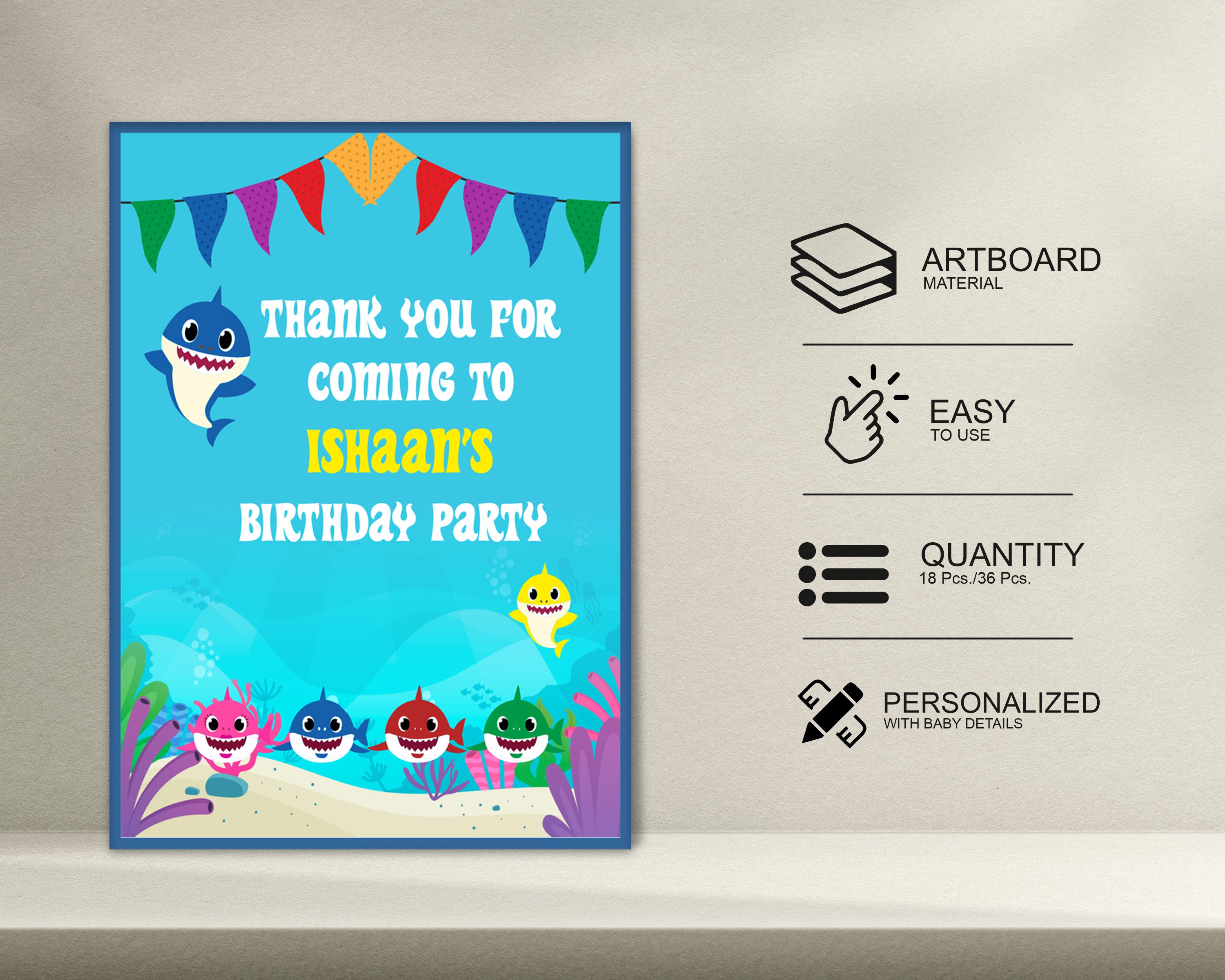 Birthday parties are fun! Send your birthday party memories in style with our Shark Boy theme based Thank you Cards personalized with baby name. Made of 225 GSM quality Art board material.