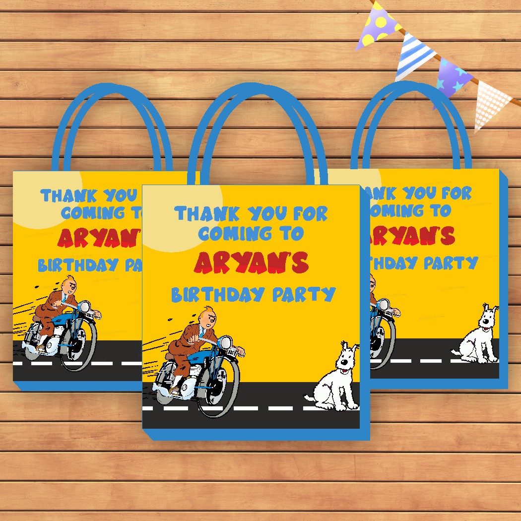 Colorful and Tin Tin theme based return gift bag personalized with baby name for take away gifts for guests. Made of 225 GSM quality Art board material and it can withstand upto 400g to 600g of weight also will have satin ribbon at the top to hold it (Colour of satin ribbon will be based on availability).