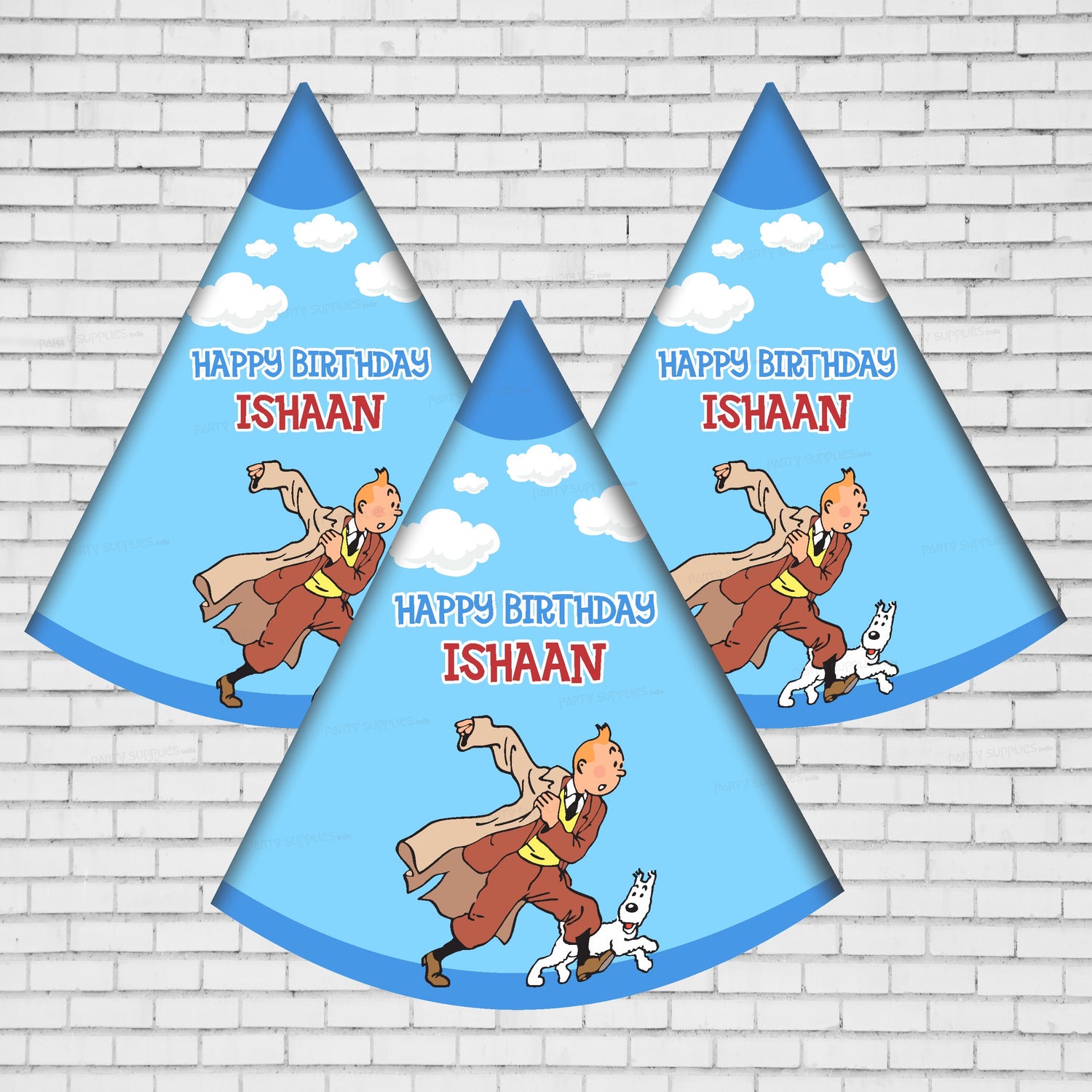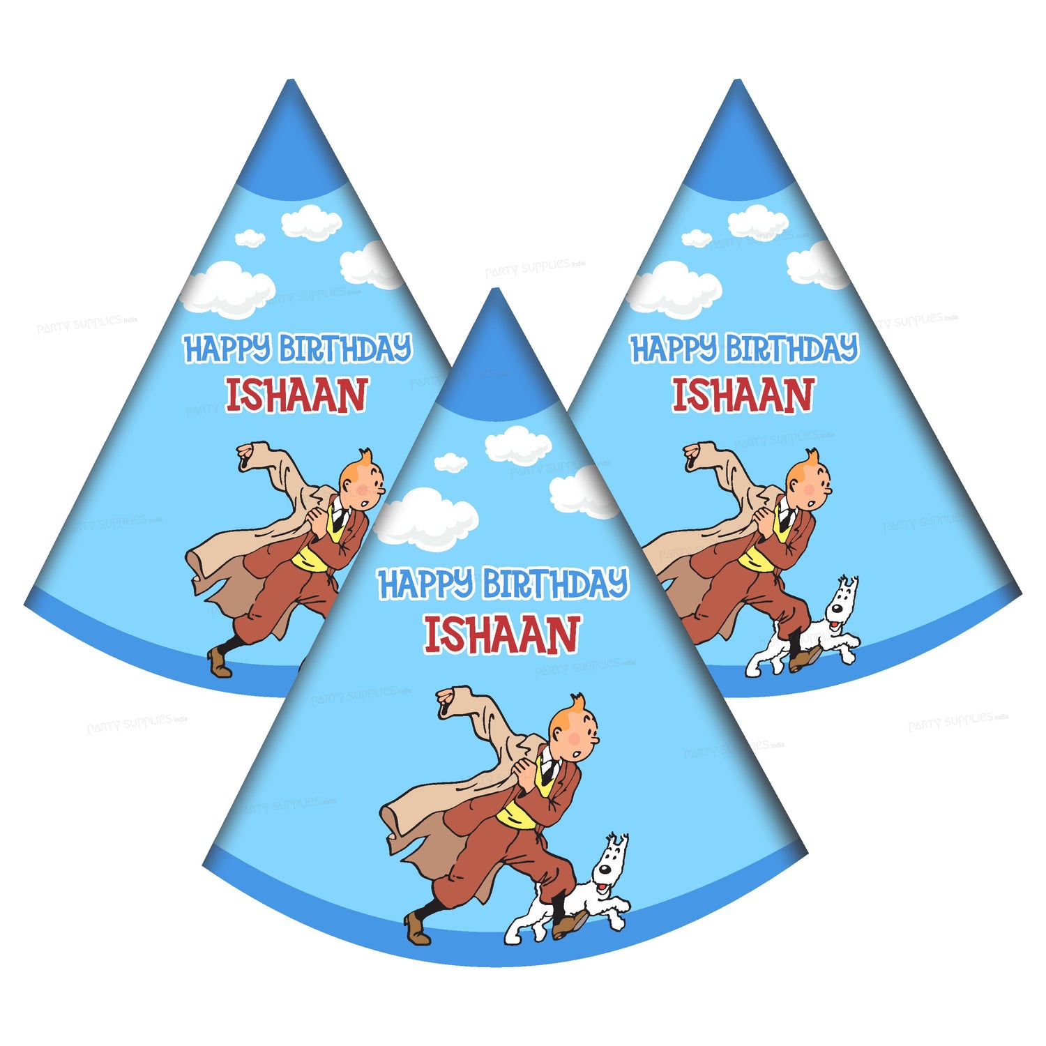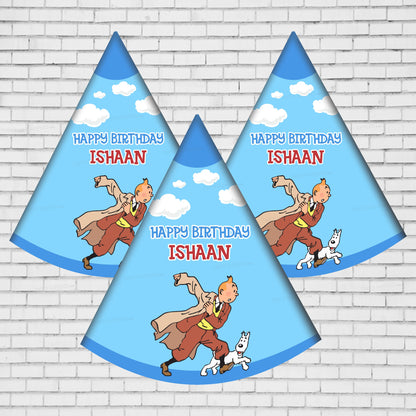 Pack of 5 Tin-tin Party Hats from the Tin-Tin range. Party Hats are cone-shaped and made of cardboard with an elastic cord to help secure them.Cone party hats each feature an image of Tin-tin with the kid's name.Hand out to guests for them to wear, display on your party table as a party decoration, or use as a party favour to fill a party bag.