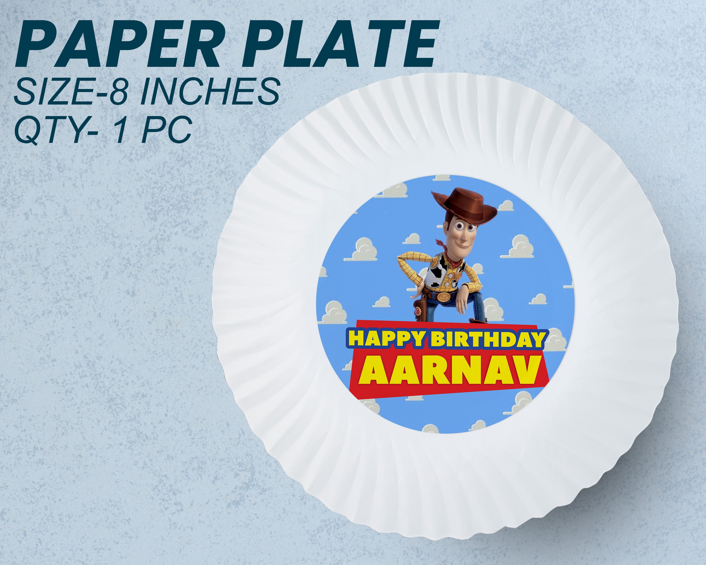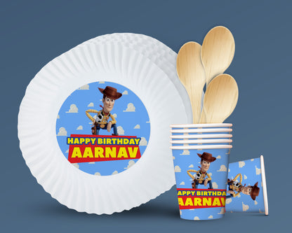 Printed party cups, plates, and plain spoon combo birthday party supplies for themed parties are available with us. They are disposable and made of eco-friendly materials. Our plates are made of thick paper, with theme-based customization including baby details added, designed, printed, and pasted onto the plates and cups as shown in the reference images. They will be available only in combo sets in the below-mentioned variants.