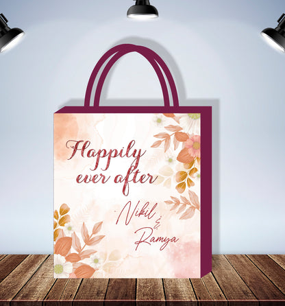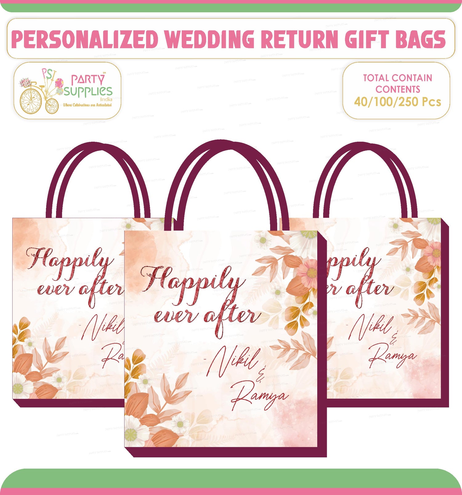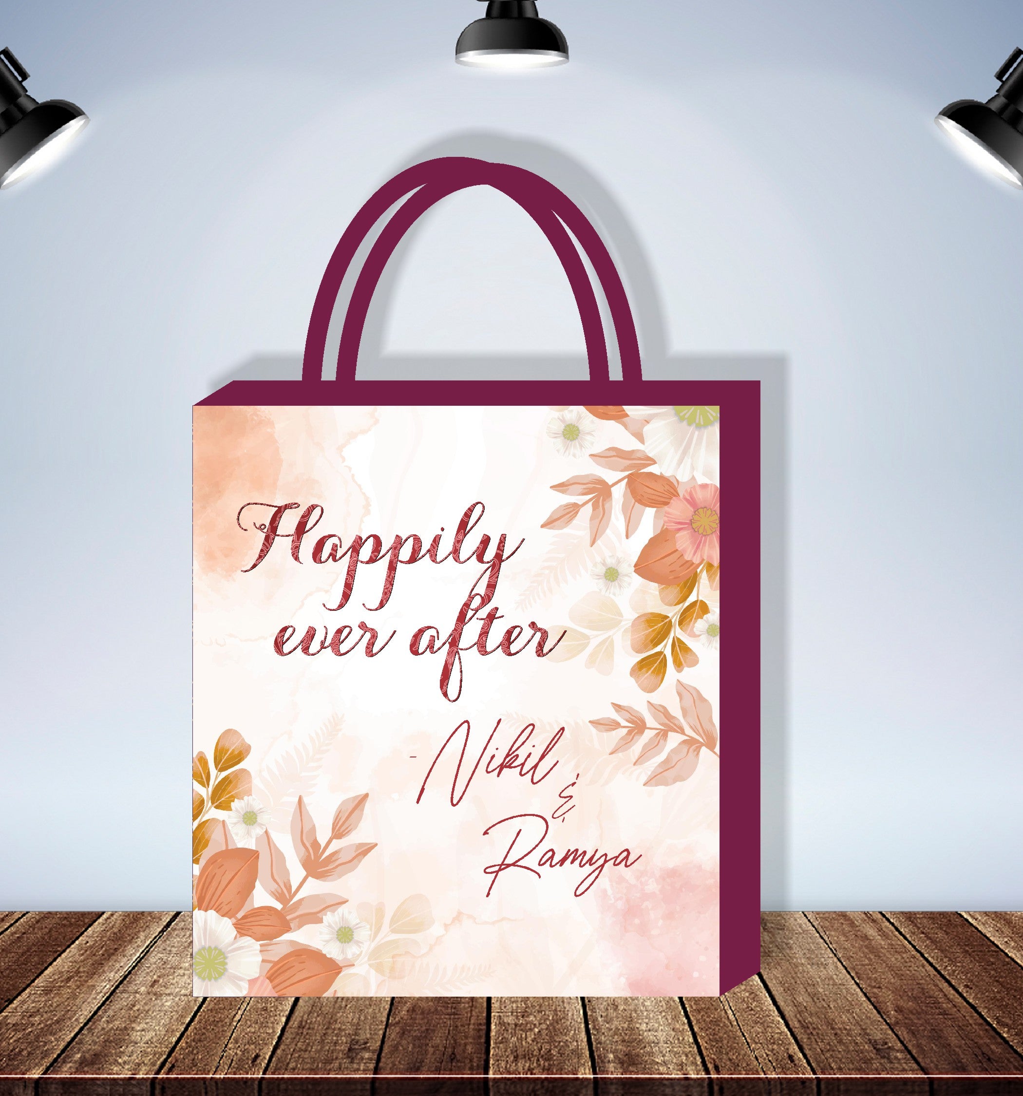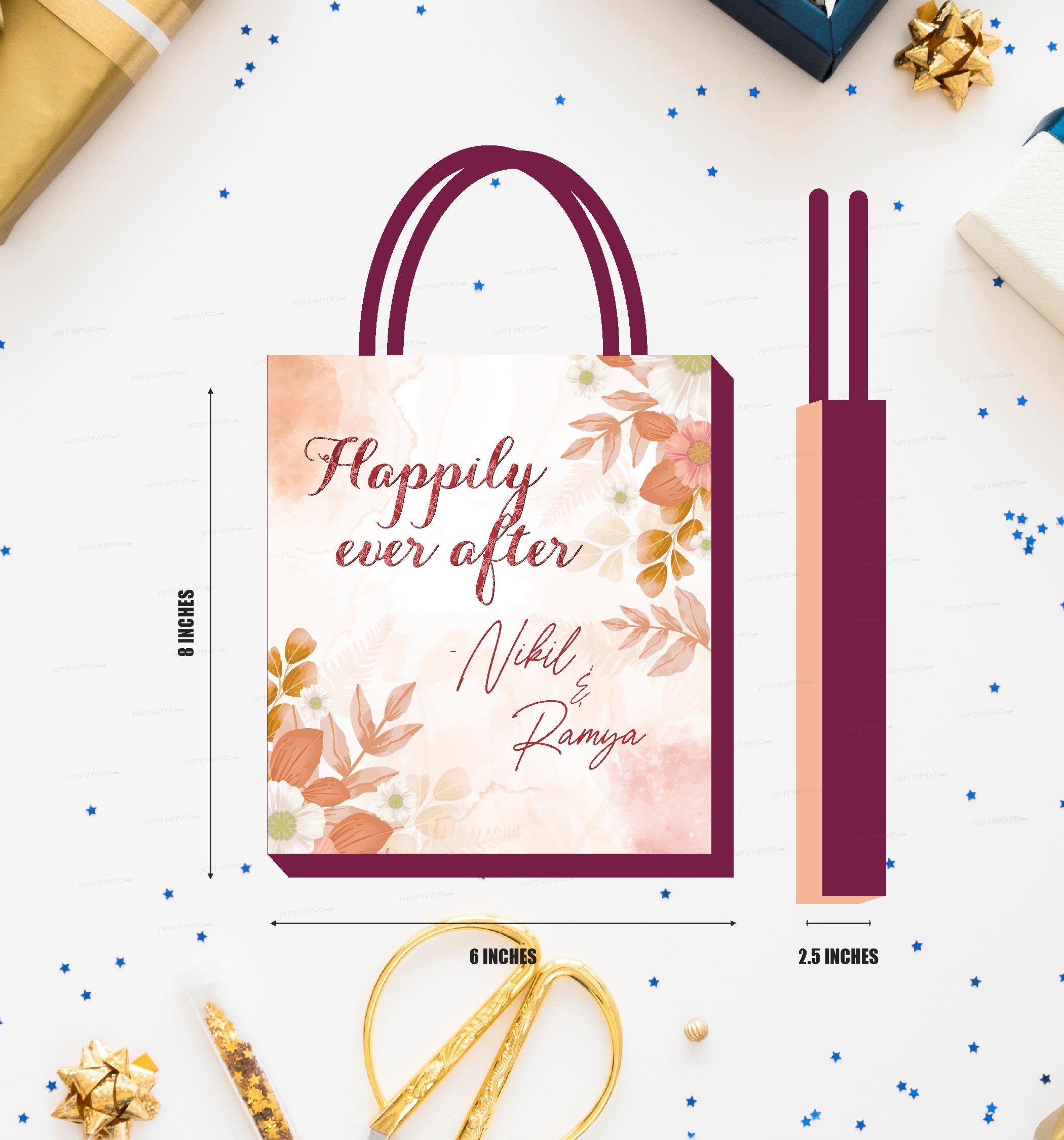 Colorful and Wedding theme based return gift bag personalized for take away gifts for guests. Made of 225 GSM quality Art board material and it can withstand upto 400g to 600g of weight also will have satin ribbon at the top to hold it (Colour of satin ribbon will be based on availability).
