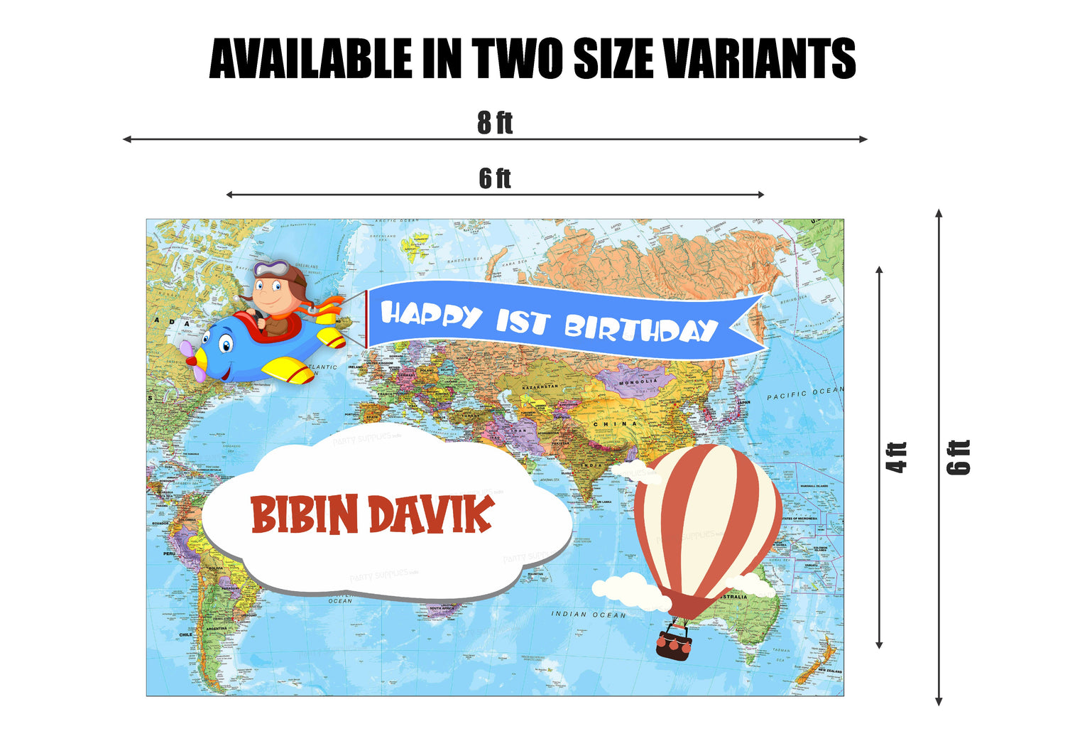 Lets travel the world on your kid's birthday. With the vintage airplane and hot air balloon over the vast expanse of blue sea, this vivid backdrop personlised with your kid's name and a snippet would look great.