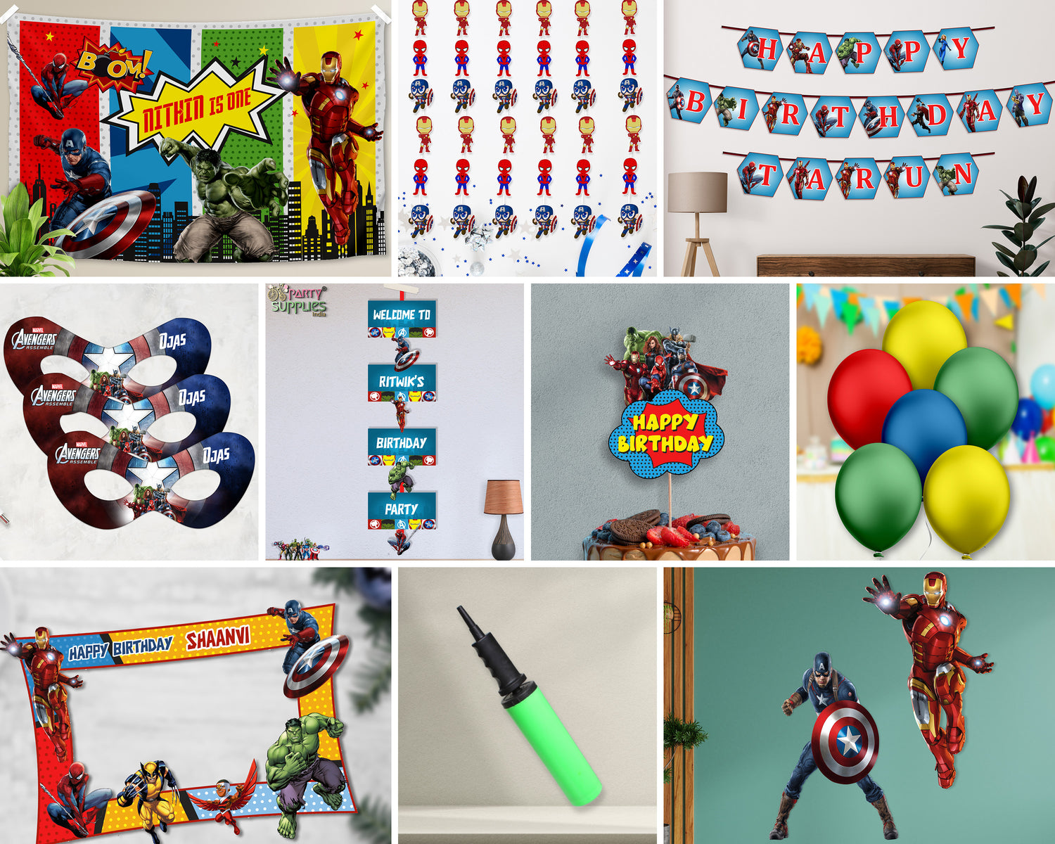 Have any superhero wannabes at your house? Not just any super heroes, we are talking about the Avengers team. What birthday boy doesn’t love getting his “boom”, “pow” and “wham” on while sporting a superhero cape? Our compilation includes party supplies — that will totally wow you .There are masks, banners, and other decor items. Create the perfect atmosphere for your Avenger’s birthday party by using decorations inspired by the Avengers theme and color palette. Exclusive Kit is Available for Avengers Theme.