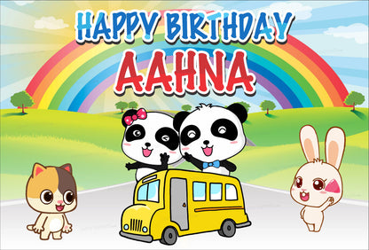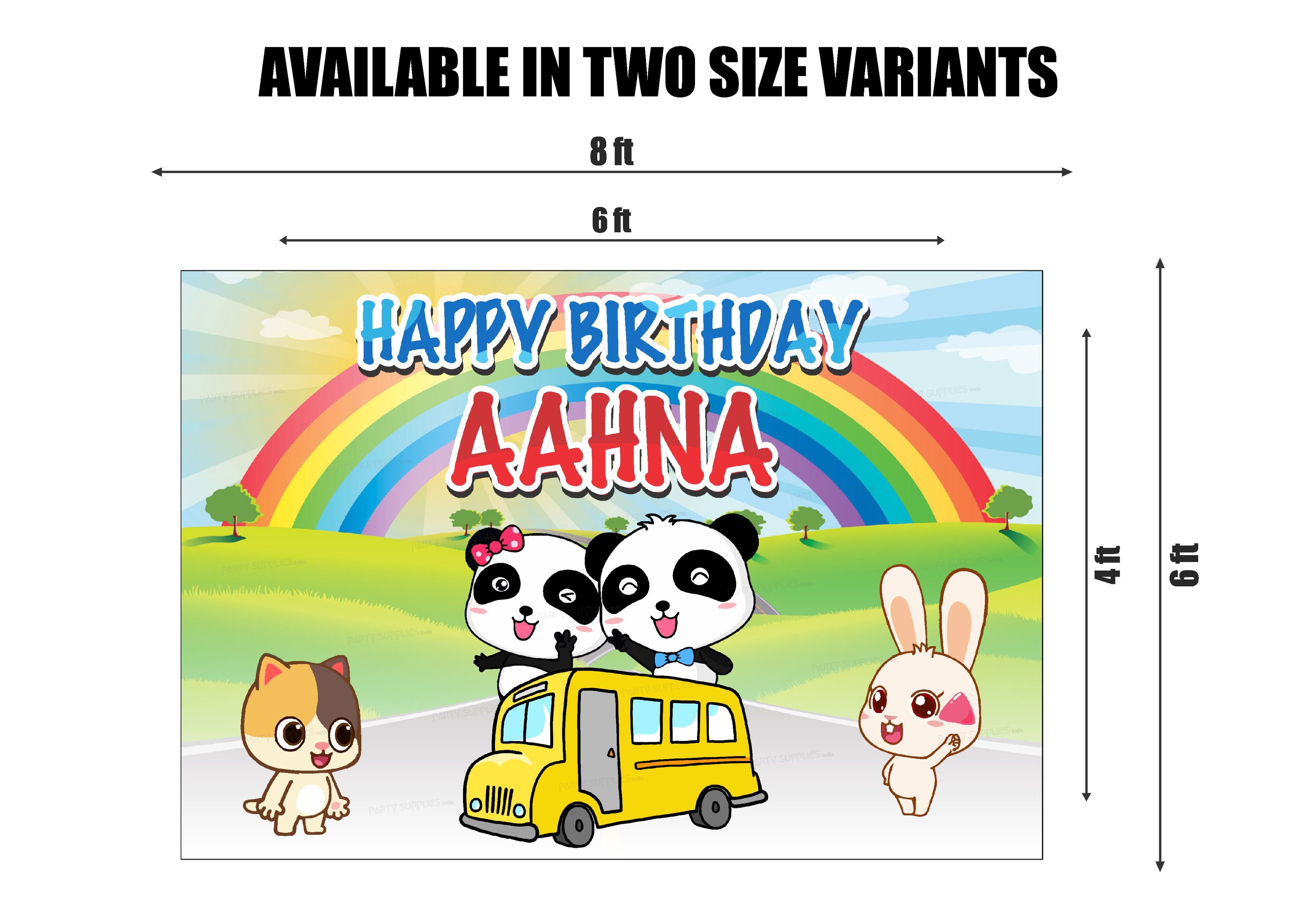 The backdrop banner features Kiki and Miumiu, the main characters in the Baby Bus cartoon educational series for toddlers.  This banner can be personalised with your kid's name and message to do with it.