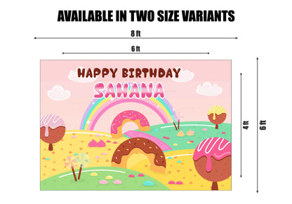 This candy themed backdrop with donuts, candies and fun typography is a colourful one to make kids and everyone see the Candy land spread before them.