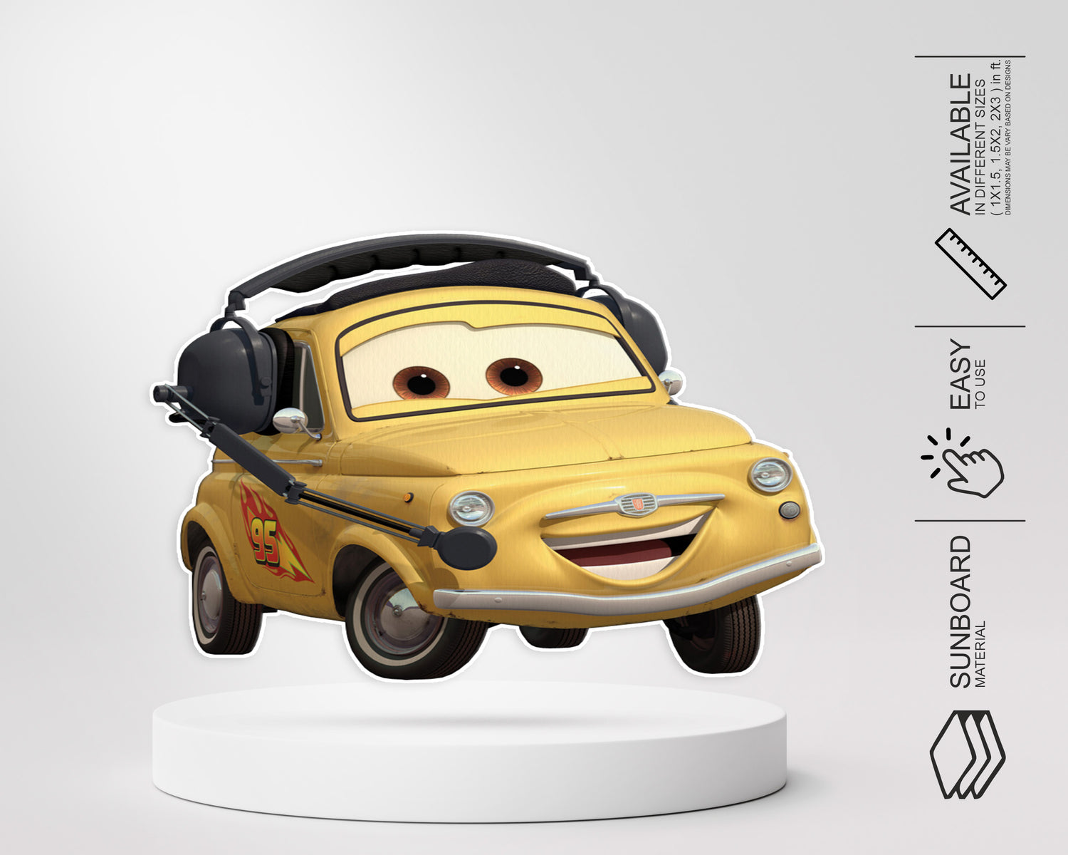 The theme based cut out depicting the grinning car on art board (300gsm) should for sure be a part of the decor. You can chose the picture you want and personalize it with your kid's name.