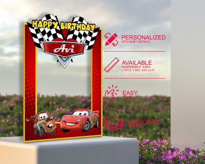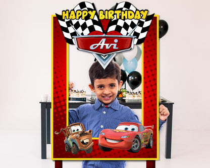 Memories stay with us forever. Pictures help us preserve them. A birthday party would always have pictures as great takeaways. Customise this Disney Cars themed photobooth with your kid's name and add a photo of the cute one too.