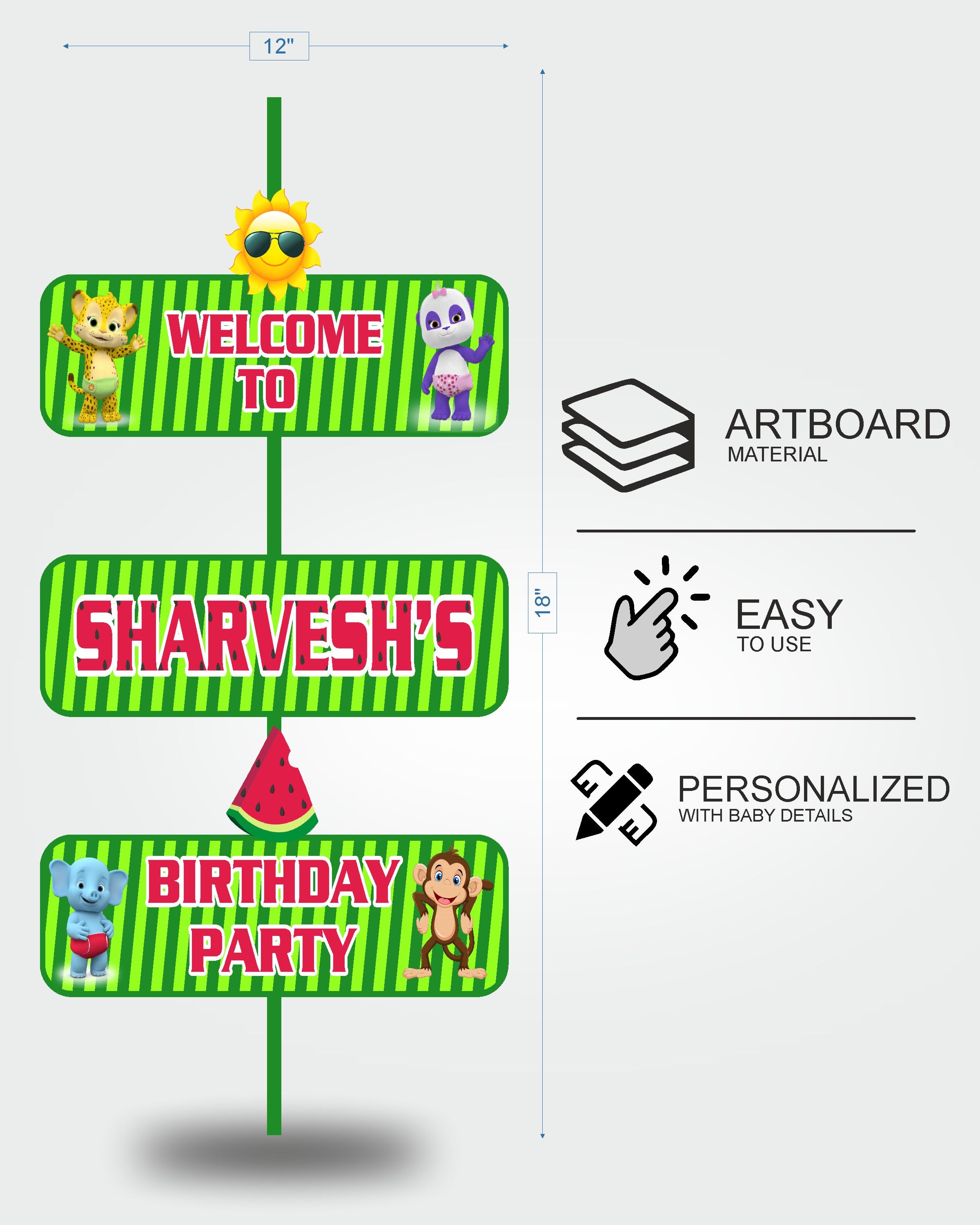 Begin styling a playful fun filled Coco Melon party when you choose a Welcome Board! The vivid colors and fun design will greet all of your party guests as they enter. Personalize with the name and age.