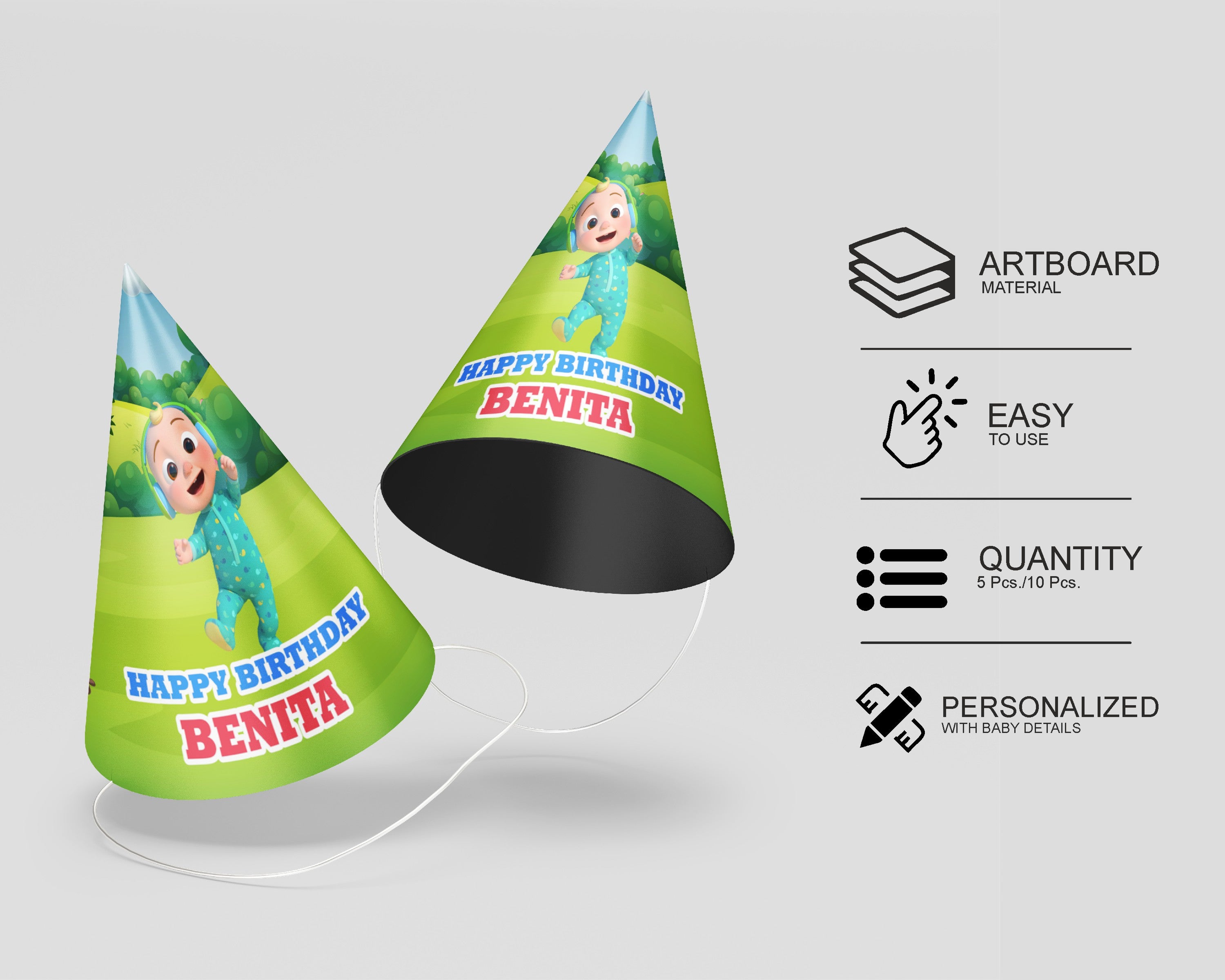 Ta-dah! Our hats feature Coco Melon boy. These lovely adornments make everyone feel like Coco Melon! Printed on card stock, our paper hats add a cute touch to your favorite celebration and make fantastic party favors.