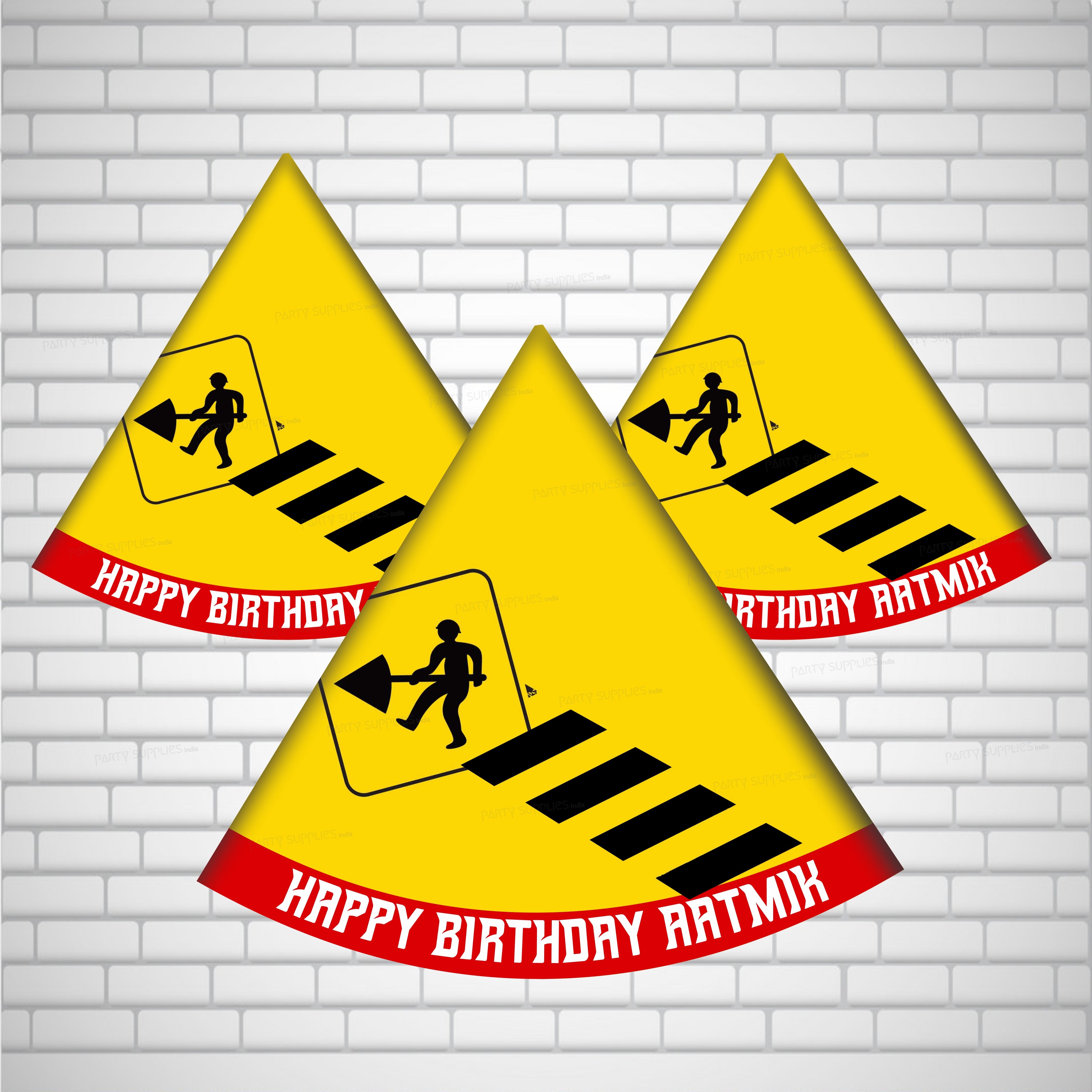 Everyone will be in the mood to celebrate when they are wearing a custom Construction party hat. This Set of 3 party accessories is a great addition to your event and is sure to get everyone smiling! Each Construction Party hat is perfectly themed and has a festive star at the top. Be sure to have your camera ready because these Construction Truck mini party hats are going to give you some great holiday photos!